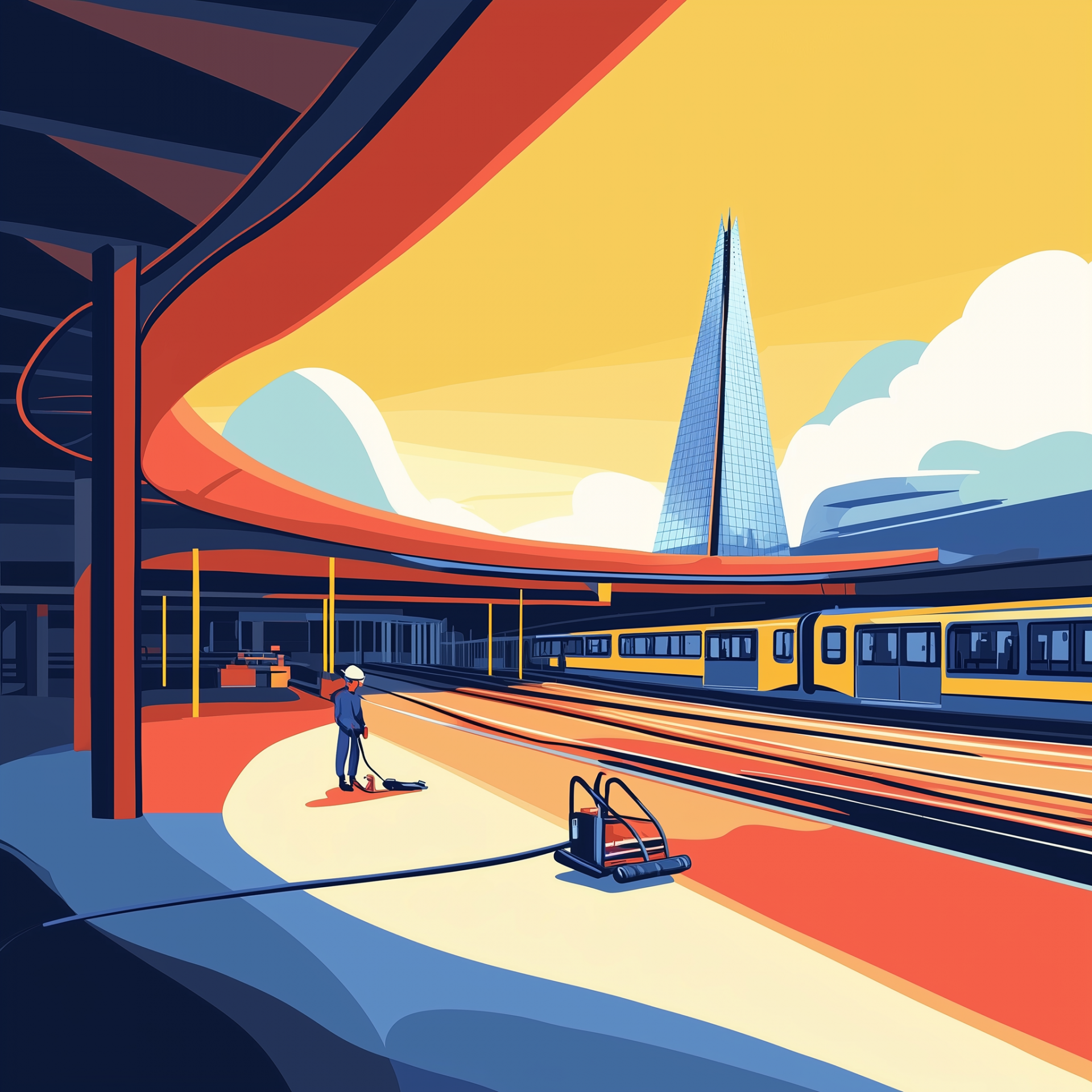 This vibrant illustration captures the bustling atmosphere of London Bridge Station during a cleaning session. The iconic Shard building towers in the background, enhancing the lively cityscape.