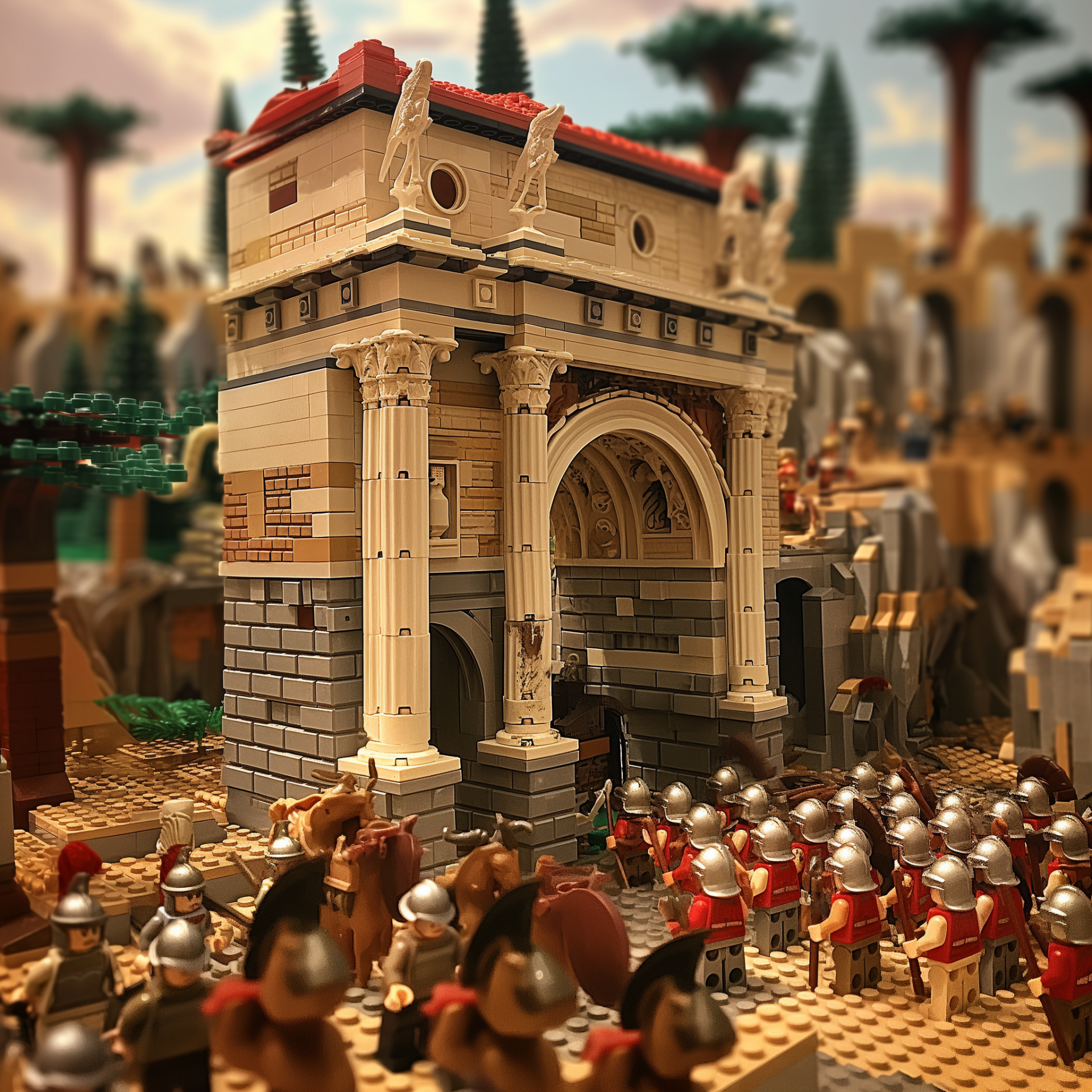 This image features a miniature representation of Forum Romanum constructed with Lego bricks, showcasing Roman military figures and architecture. The vibrant colors and intricate details of the Lego set bring a playful yet historical element to the scene.
