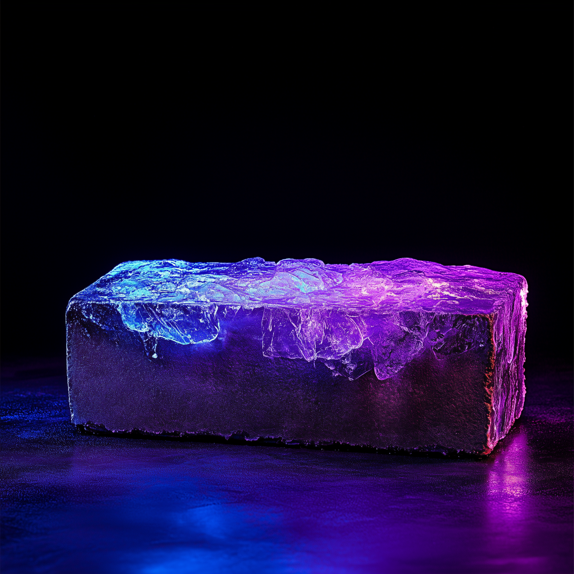 The image features a solitary dark concrete brick set against a black backdrop, illuminated by deep purple and light blue lights. Ice is visibly forming on the brick, enhancing the contrast and creating a cold atmosphere.