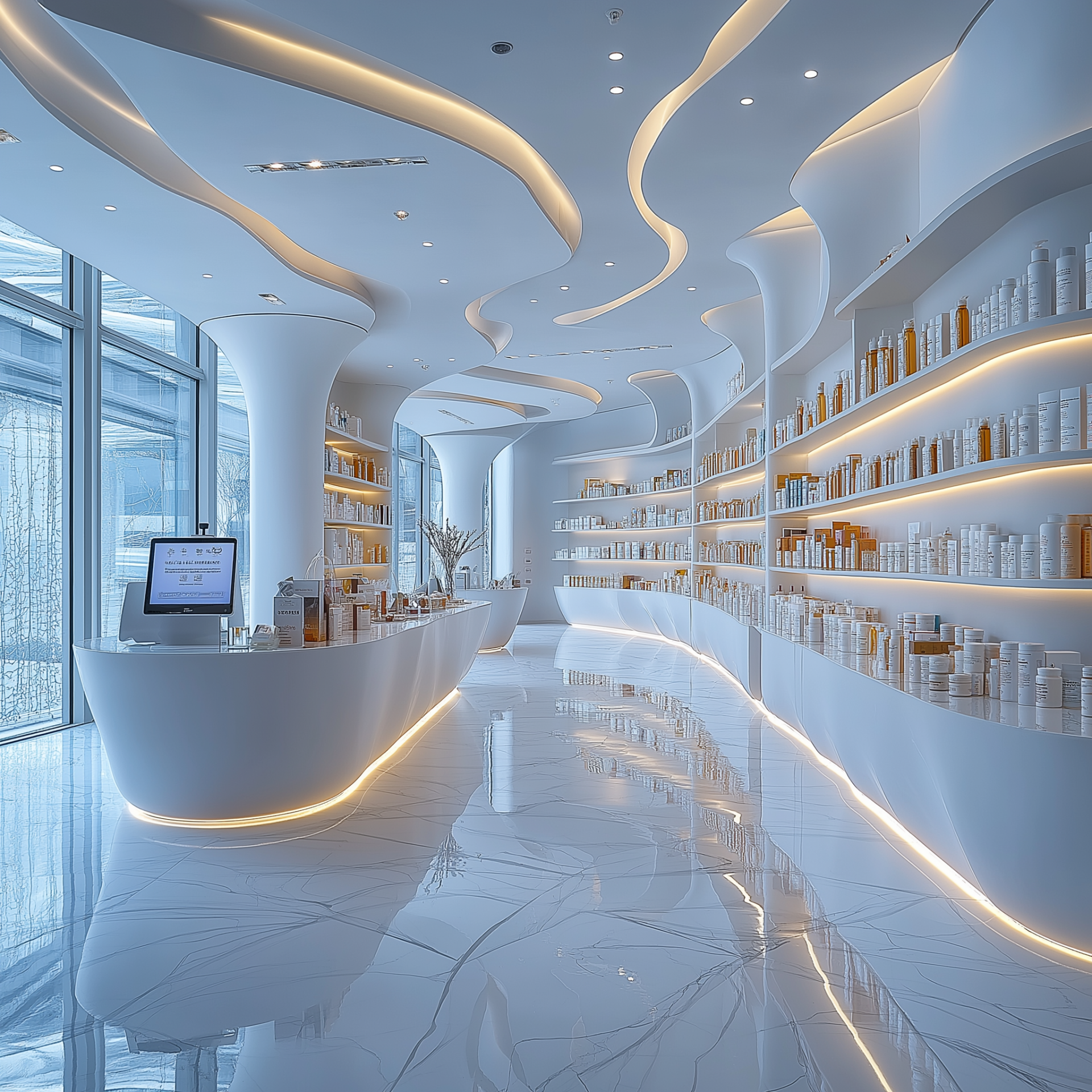 This image showcases a bright and minimalist interior of a modern pharmacy. Soft natural lighting and elegant design elements create a welcoming and professional atmosphere.