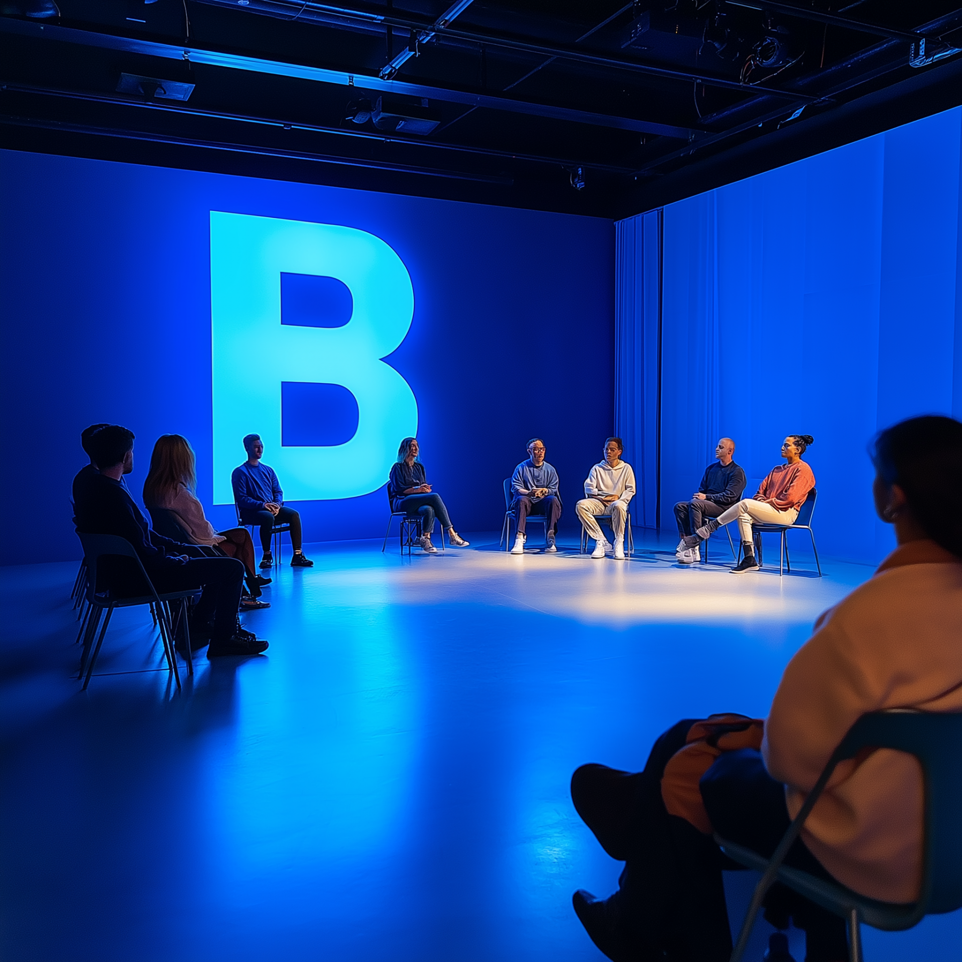 The image captures a lively setting with multiple people sitting on chairs in a bright blue room. A large letter B prominently decorates the wall, enhancing the vibrant atmosphere of this variety show.