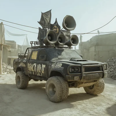 A sleek and modern matte bronze pickup truck with tinted windows and luxury black rims, set against a backdrop of sandy desert dunes. The thick tires and futuristic design of the vehicle give it a rugged yet sophisticated appearance.