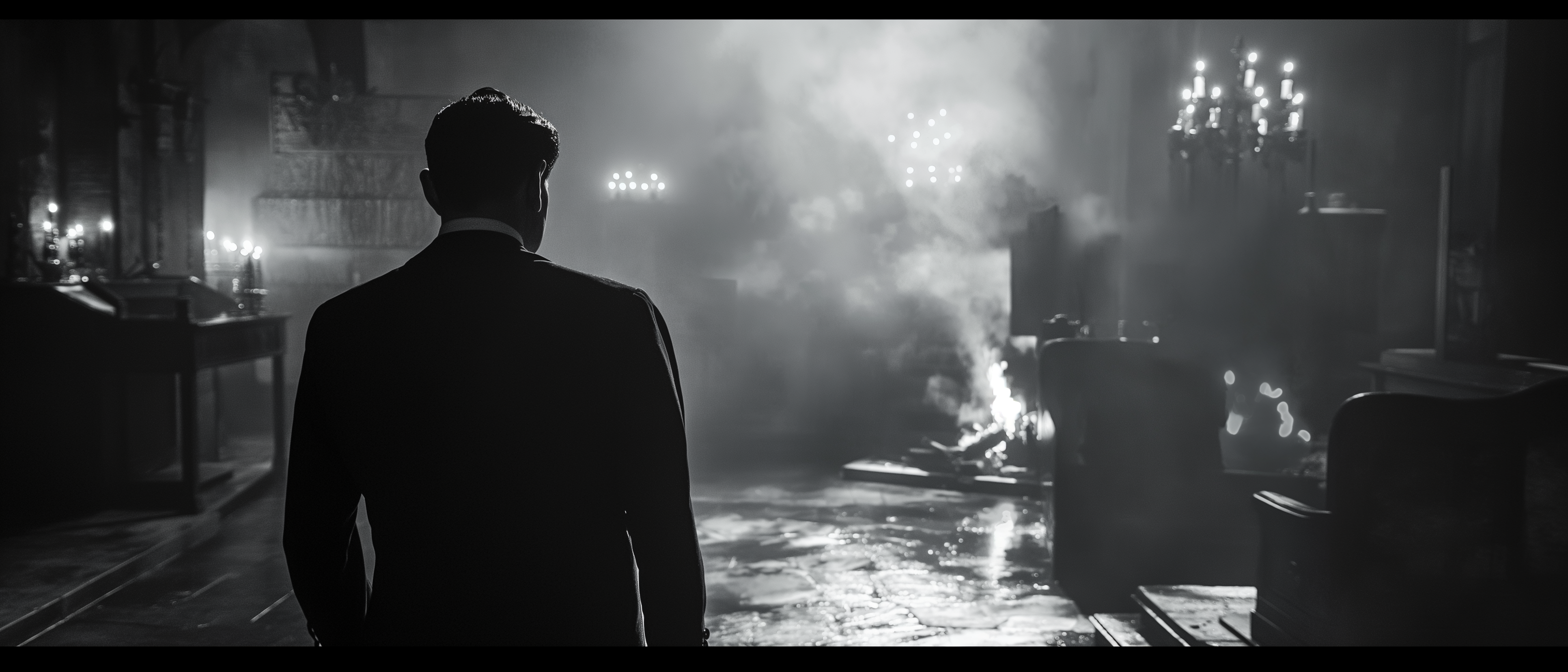 Dark and mysterious image capturing a noir detective examining the murder scene of the goddess Ishtar, who appears to have been burned at the stake.