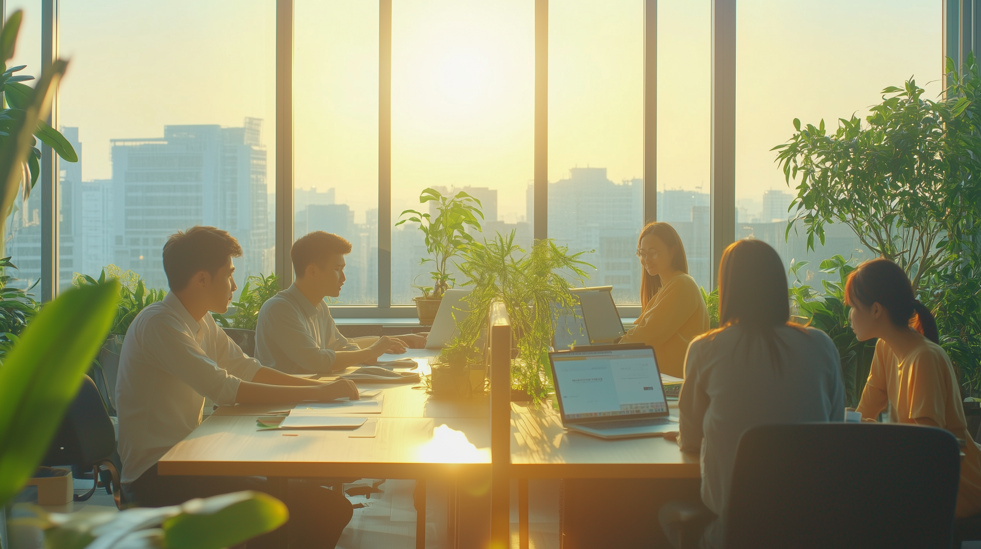 A group of six Asian professionals collaborates on budget planning in a sleek, modern office. The bright space features a minimalist design and vibrant green plants, enhancing the workspace ambience.