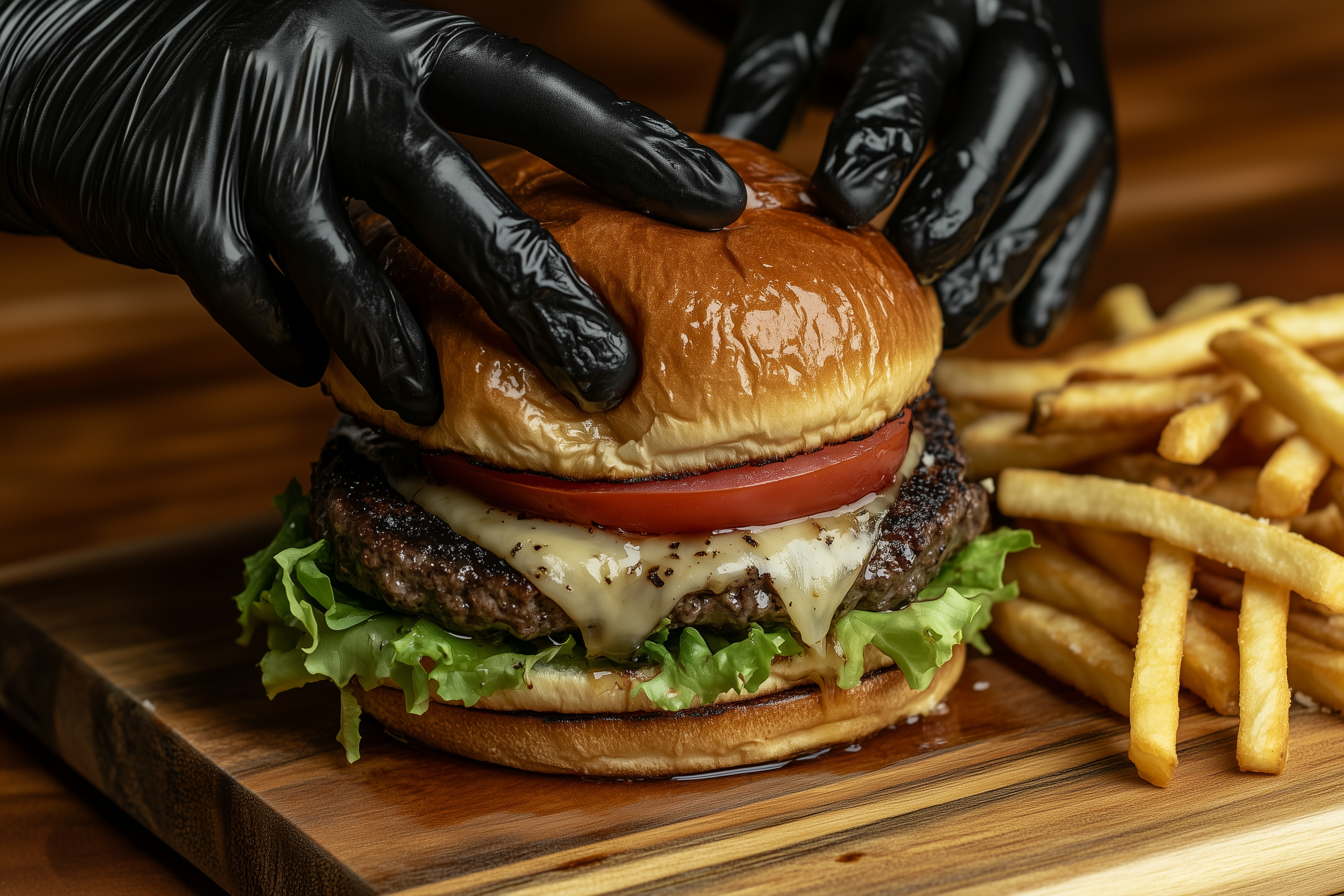 This image captures a close-up of a succulent hamburger with vibrant layers of lettuce, tomato, and cheese. The composition highlights the juicy details as the burger is being squeezed, with delicious droplet effects enhancing the overall appeal.