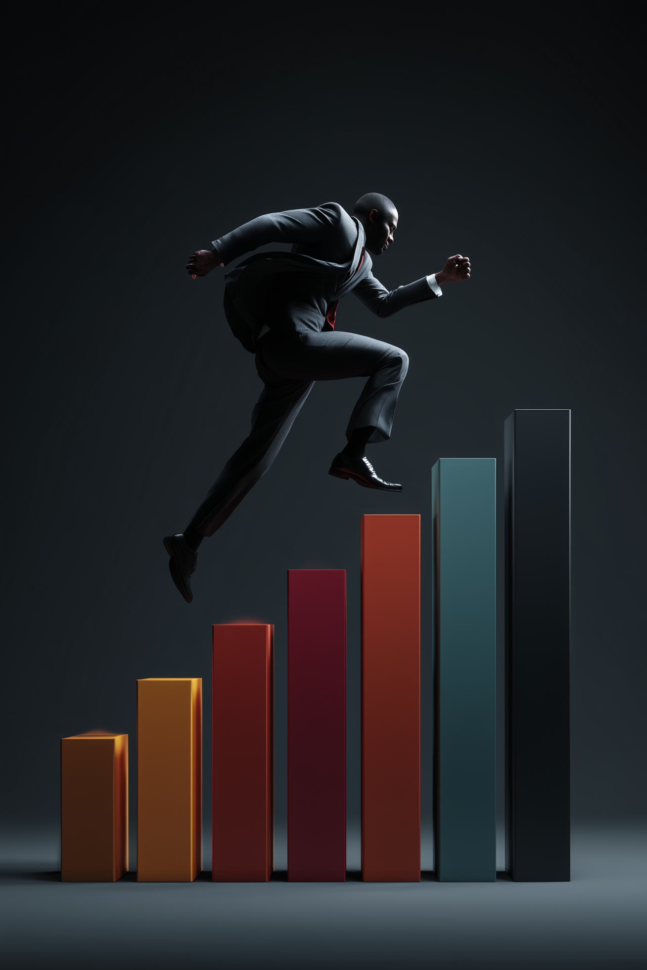 This image showcases a hyper-realistic depiction of a person in a suit energetically jumping across vibrant 3D statistics bars against a dark background. The high resolution and realistic textures create a dramatic and motivational atmosphere.