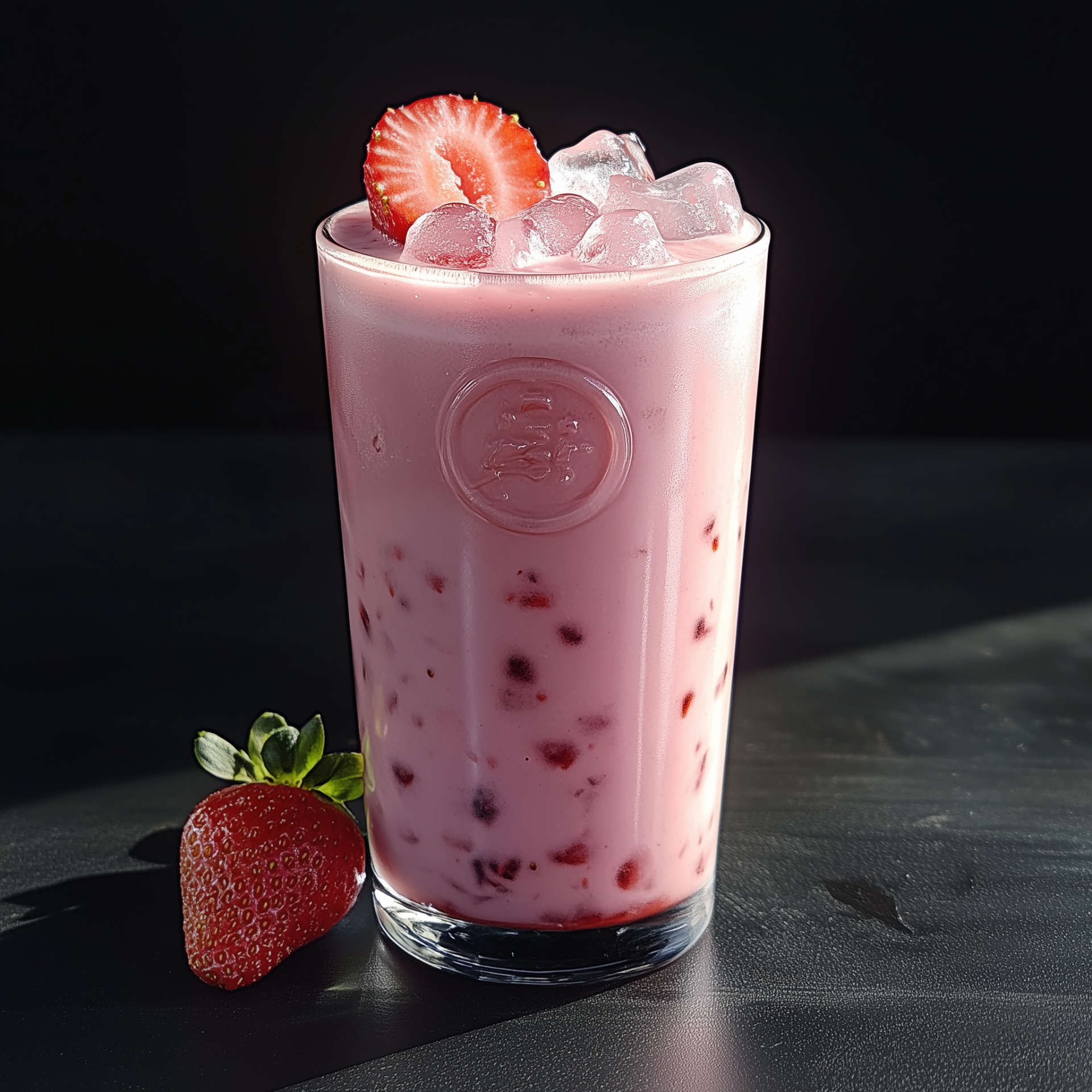The image captures a delightful strawberry latte with a vibrant pink hue, showcasing the rich strawberry flavor. The drink is adorned with cool ice and fresh strawberry slices, set against a contrasting black background that enhances its elegant and fresh appeal.