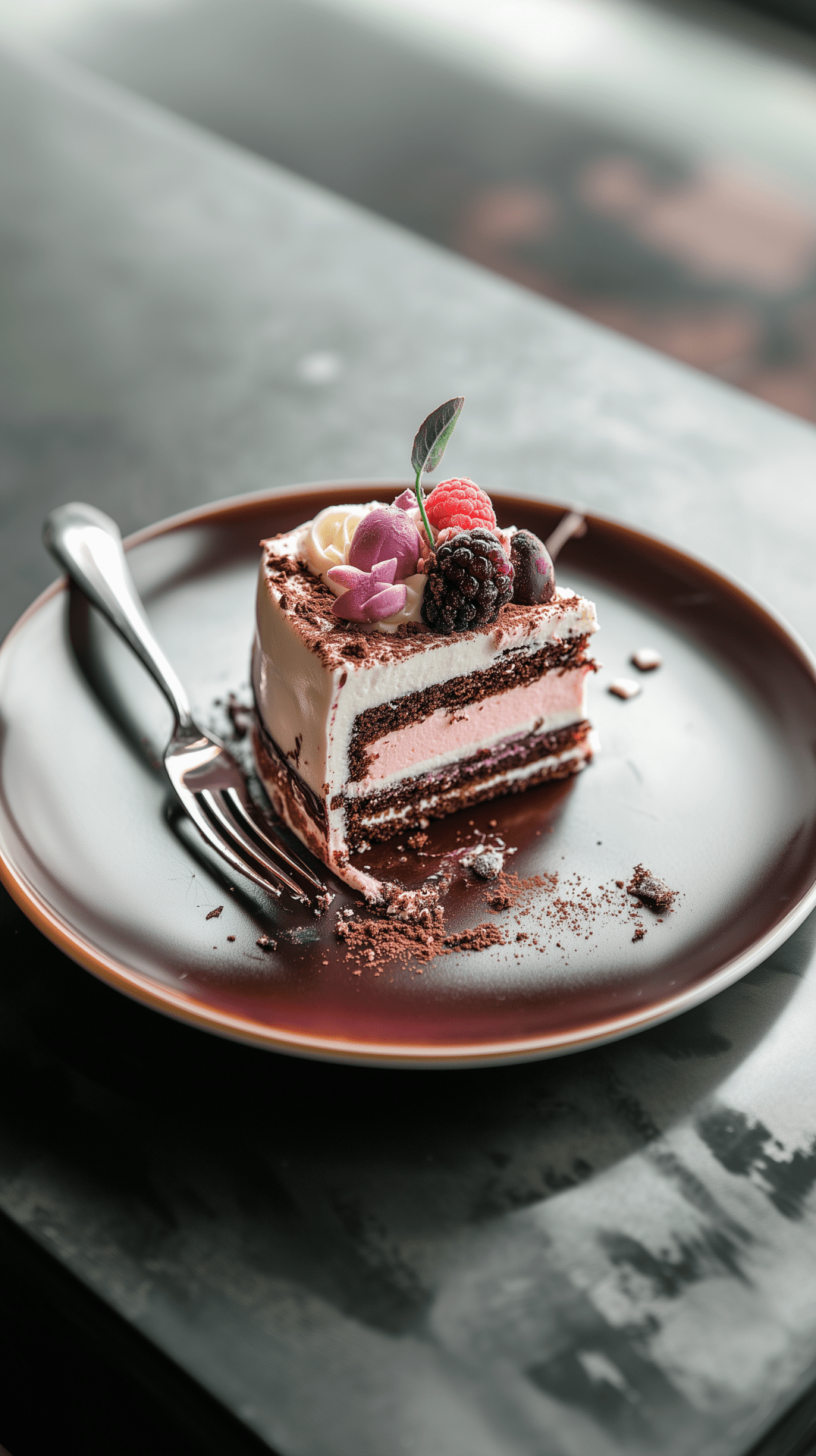 The image features a single slice of cake elegantly placed on a contemporary-style plate. The modern aesthetics of the presentation highlights the delicious texture and vibrant colors of the cake.