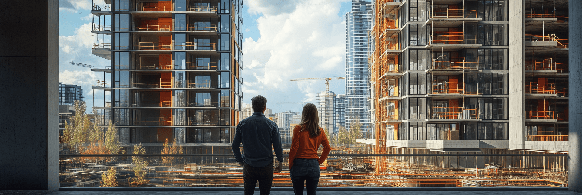 The image captures a realistic view of a male and female investor observing a multifamily development under construction. The scene reflects a sense of anticipation and progress in the urban landscape of Calgary.
