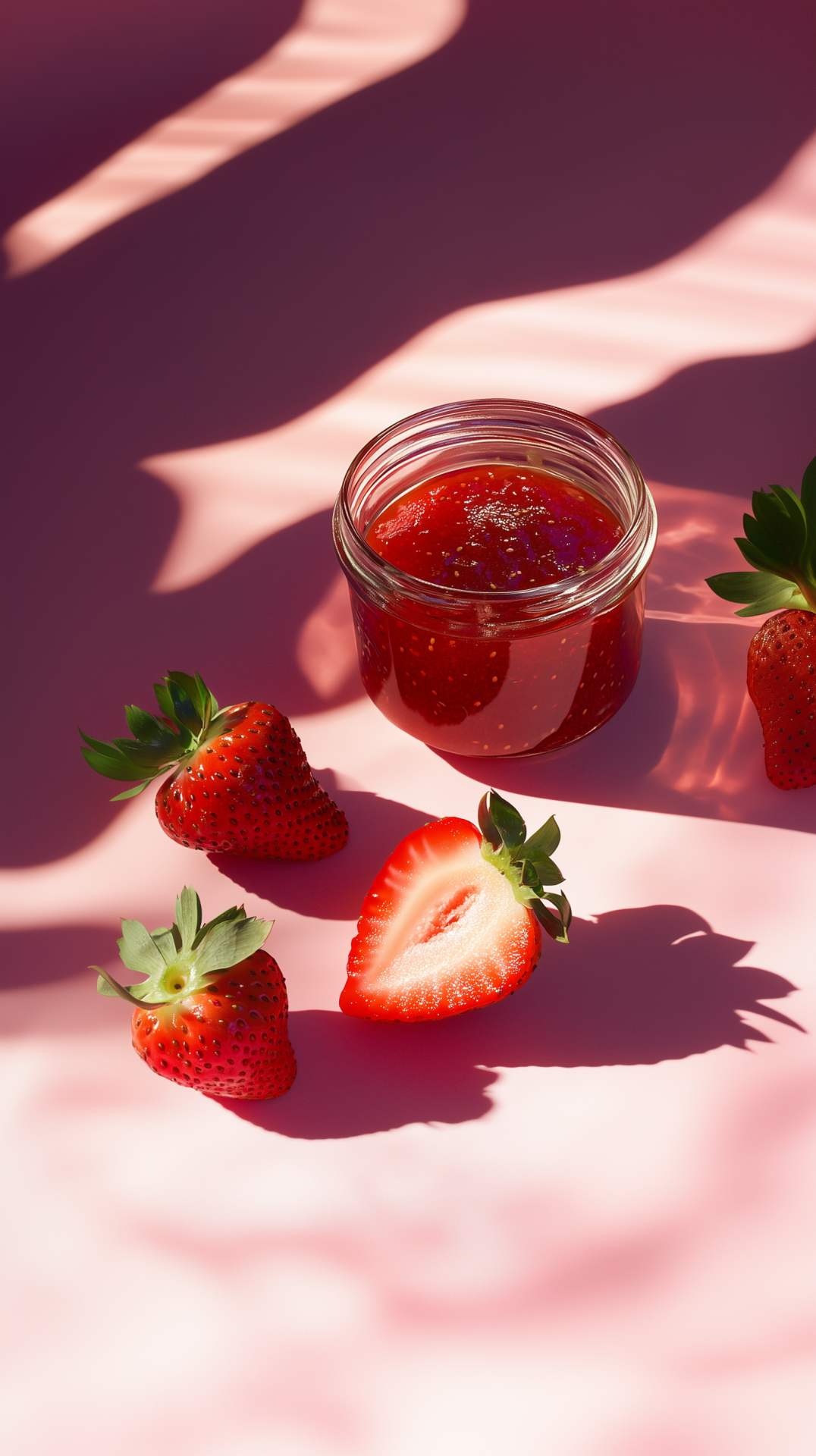 This image features a serene and minimalist composition with a clear jar filled with lush, ruby red contents. The simplicity of the jar and the vibrant color create a peaceful and inviting atmosphere.