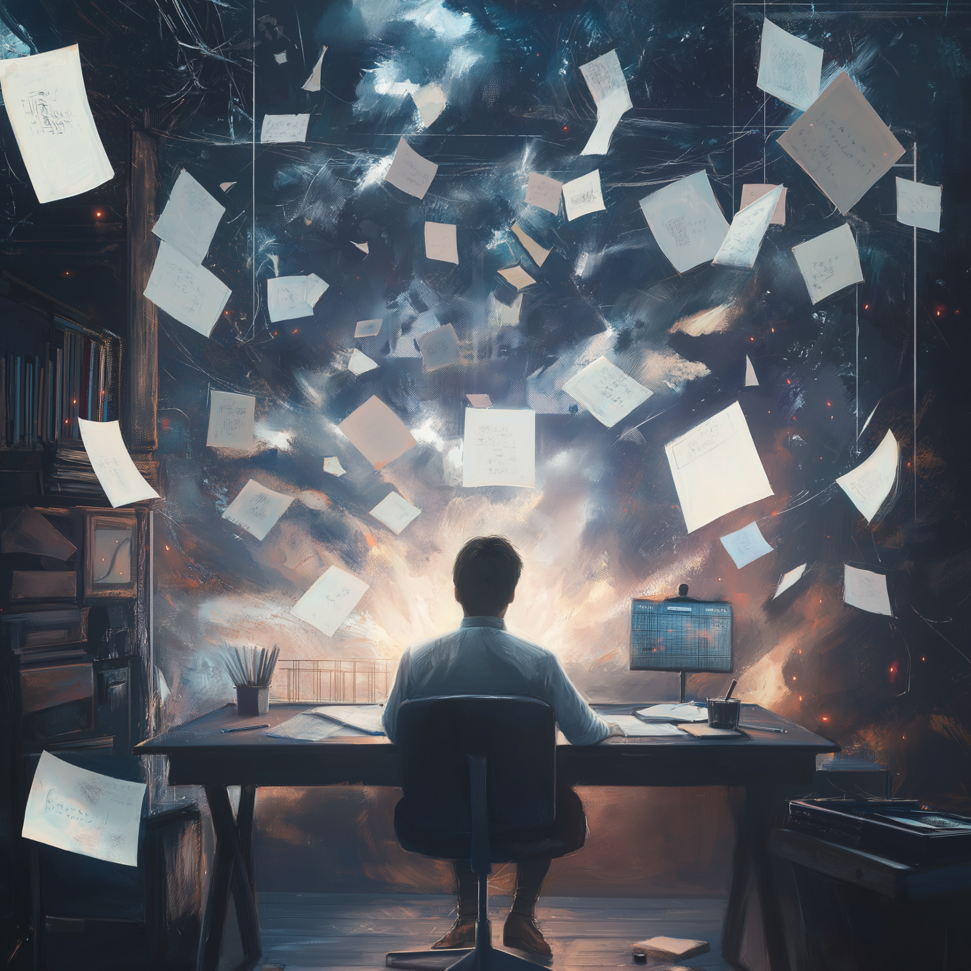 This image depicts a serene figure sitting at a glowing desk amid a surreal tempest. Surrounded by floating prompts and cascading data streams, the scene captures the essence of tranquility through creative expression.