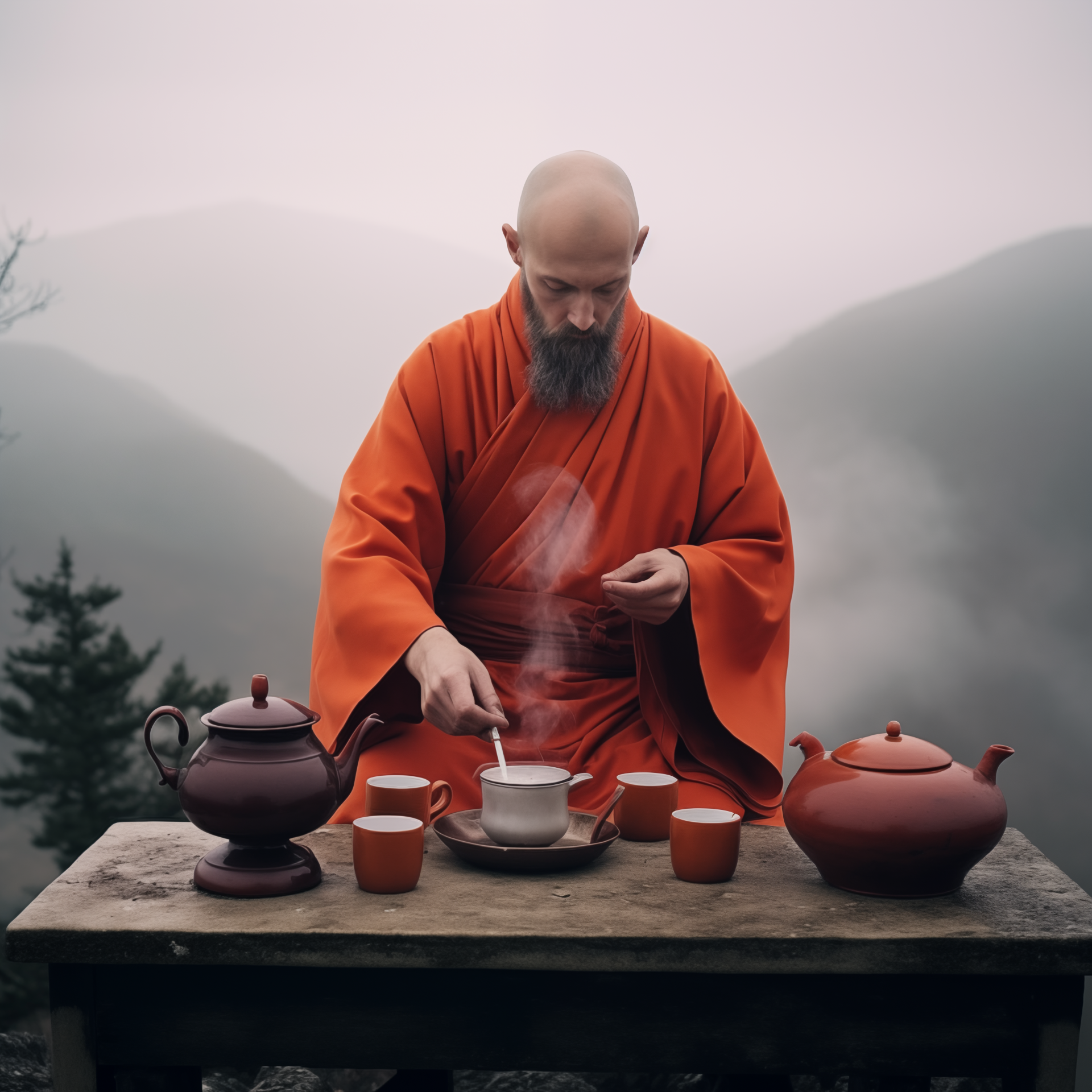 A serene scene features a bald man dressed in a vibrant monk's outfit, gracefully pouring water at a tea ceremony. The misty mountain backdrop adds an ethereal quality to this tranquil moment.