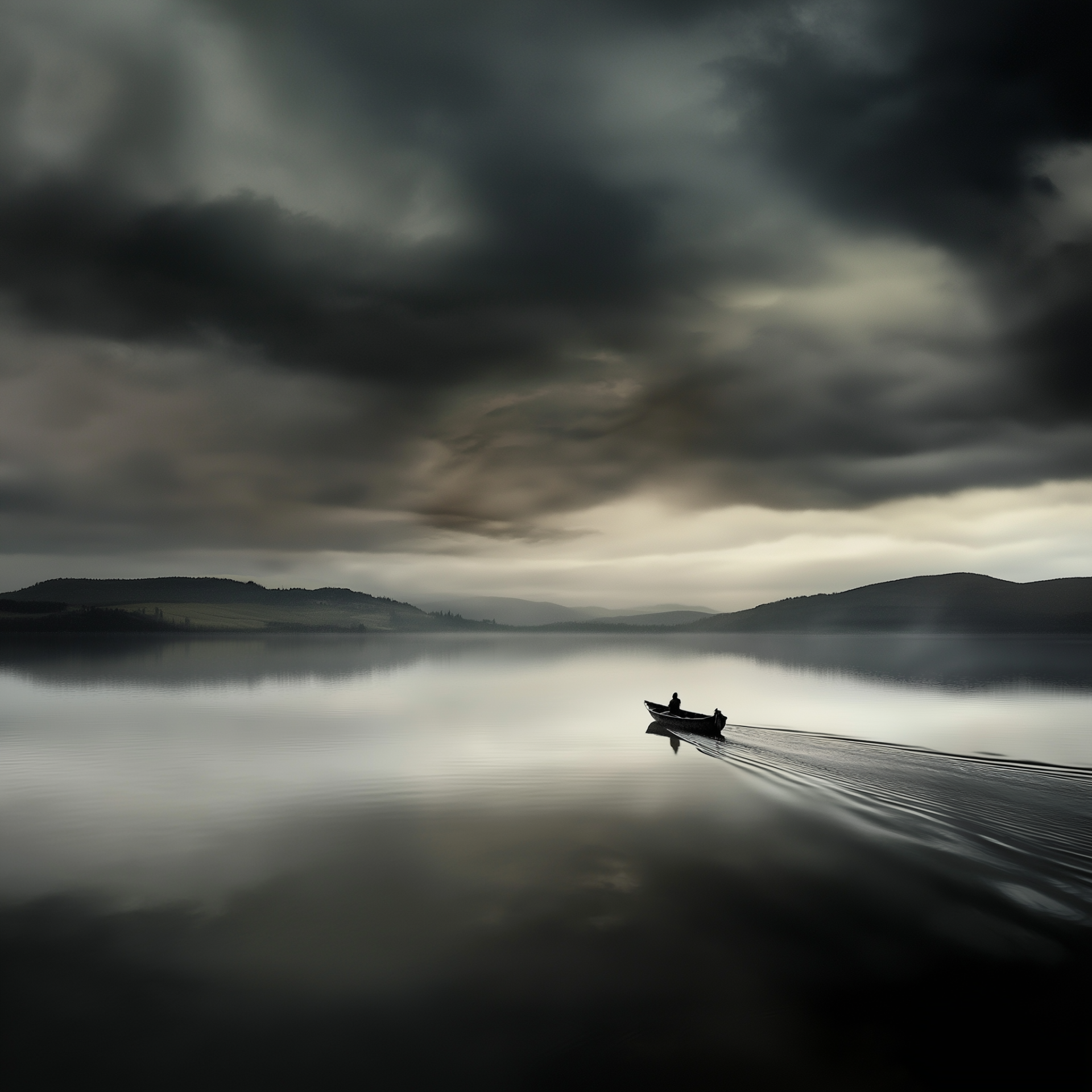 This image shows a serene and atmospheric scene with a small boat traveling across a calm body of water, leaving a gentle wake behind it. The sky is dramatic, filled with dark, moody clouds, adding to the overall tranquility of the setting.