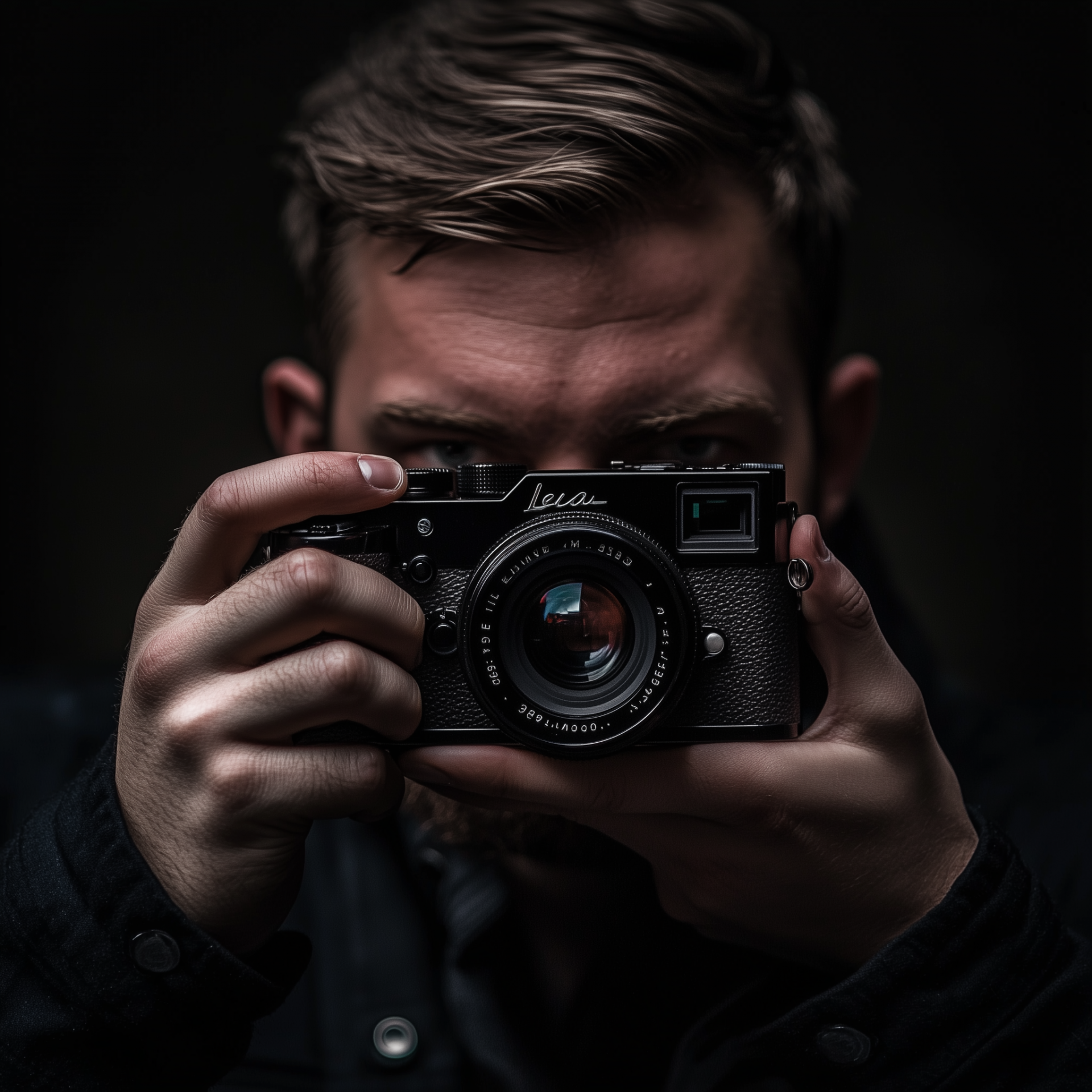The image captures a man looking directly into the lens of a camera, with a focus on his upper body and face. The dark background enhances the intensity of the moment, highlighting the camera he holds with a poised finger on the shutter.