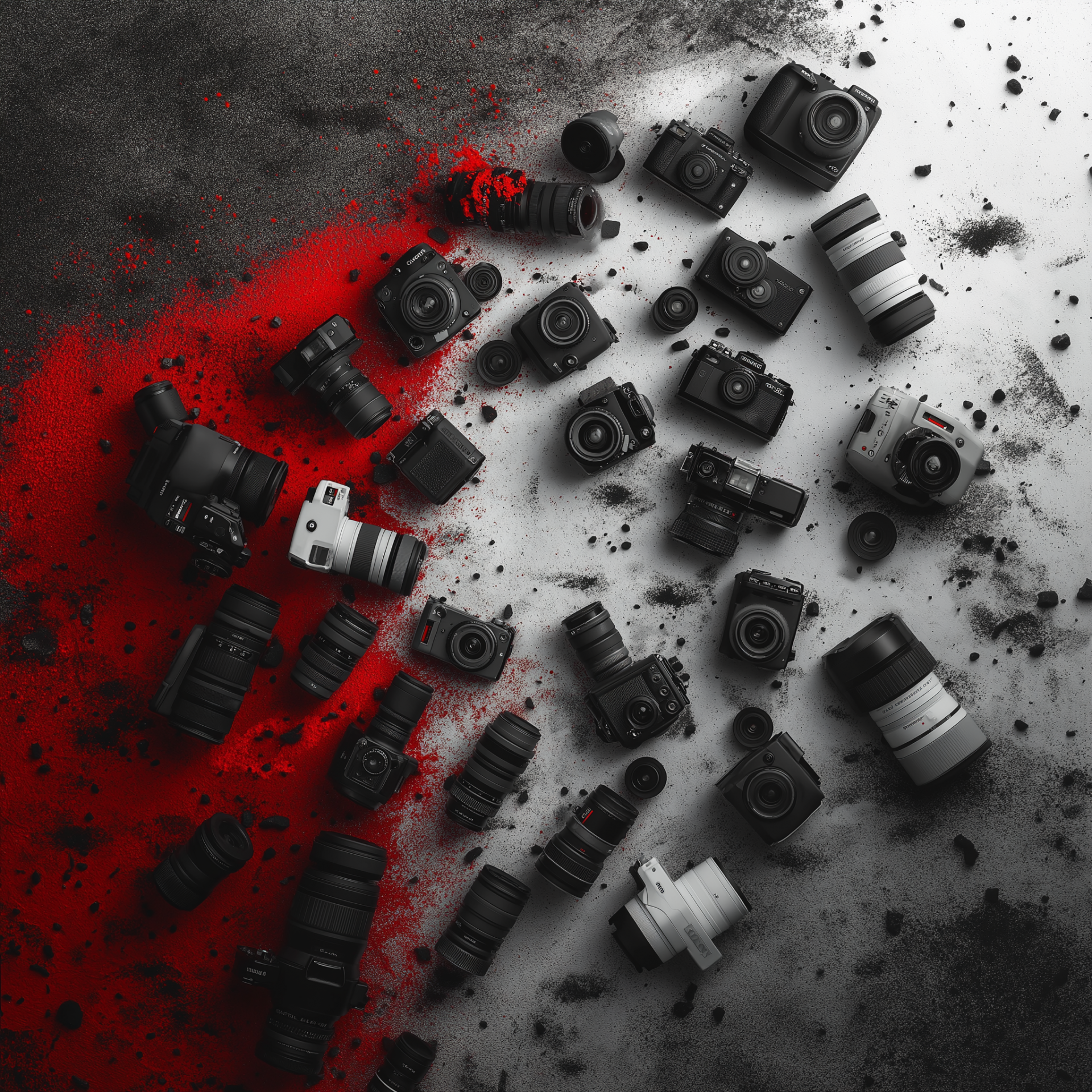 This image features a striking black and white and red sand scene, viewed from above, with numerous cameras scattered across a concrete surface. The contrast between the vibrant red and the monochromatic elements creates a bold and dynamic visual effect.
