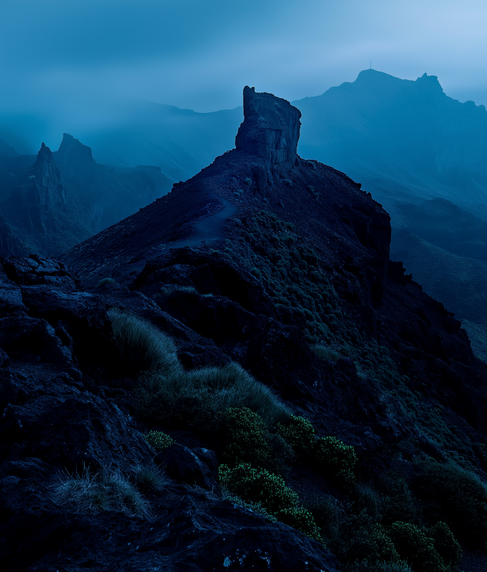 This image captures a wide shot of Roque Nublo set against a starry night sky. The scene evokes a sense of tranquility and mystique, showcasing the rugged landscape illuminated by moonlight.