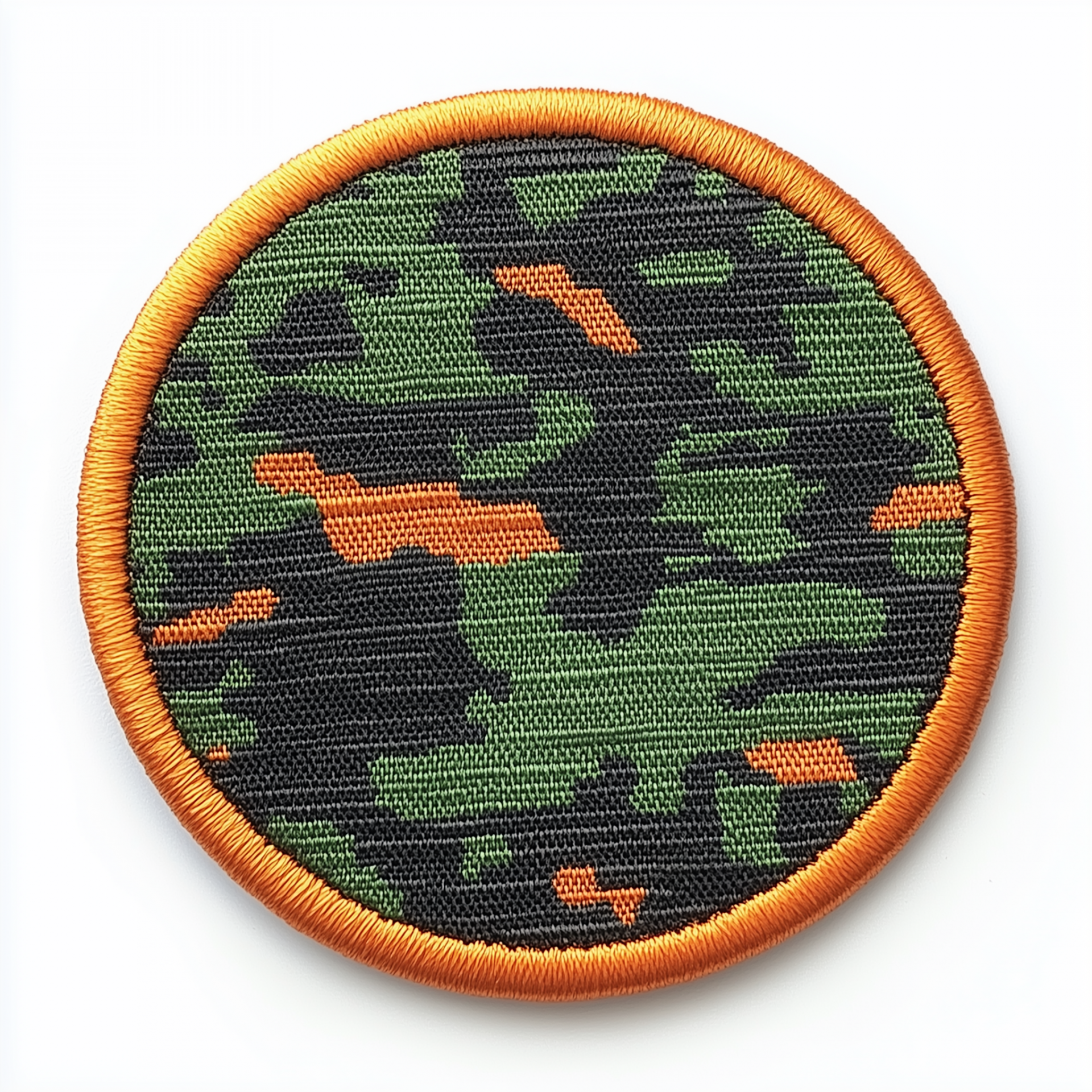This image features a round embroidered patch displayed on a clean white background. The patch showcases a realistic Multicam camouflage pattern with a vibrant orange border, highlighting its intricate stitching and fabric texture.