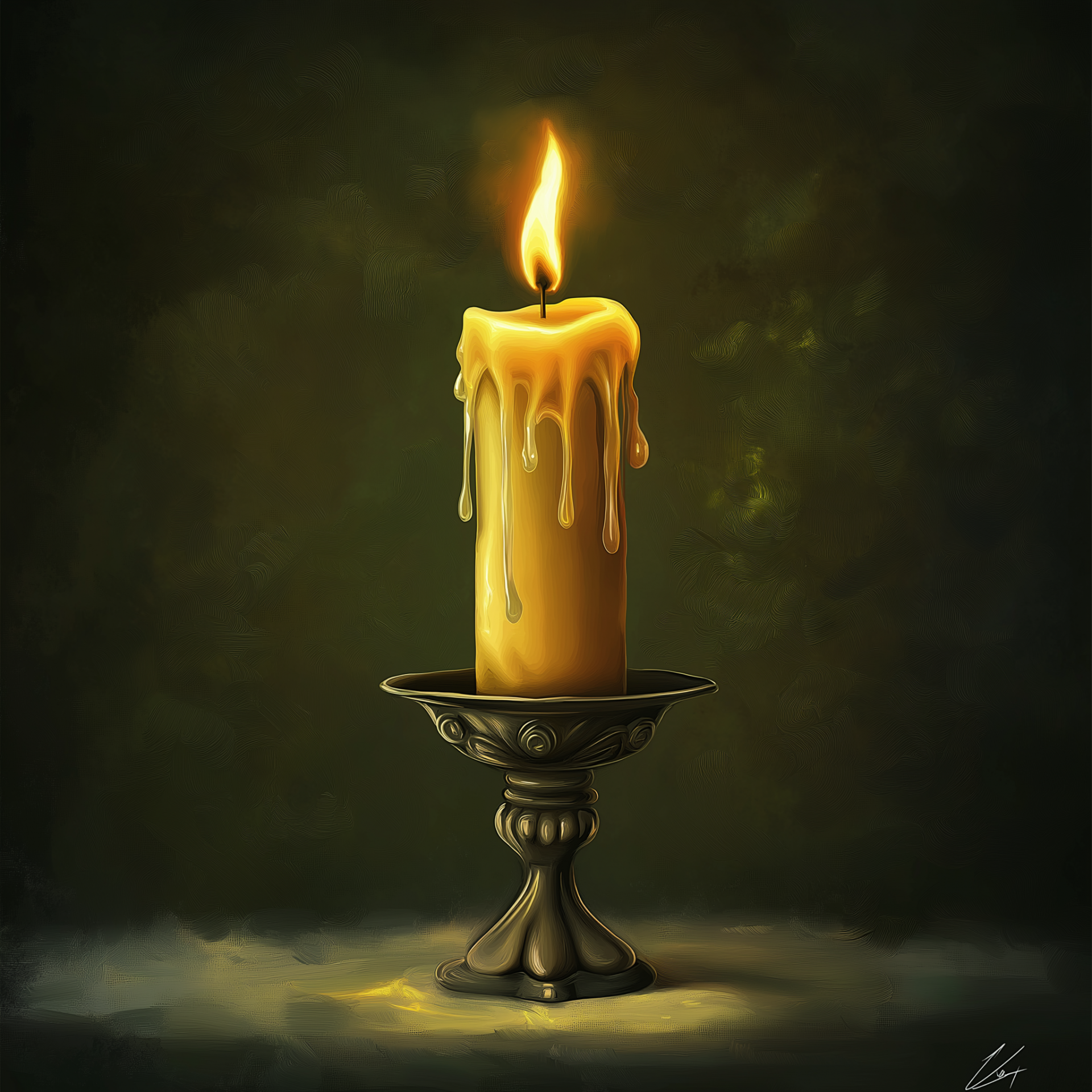 The image presents a highly detailed digital painting of a candle burning in an ornate candlestick. The warm glow of the flame casts a soft light, creating a serene and calming atmosphere.