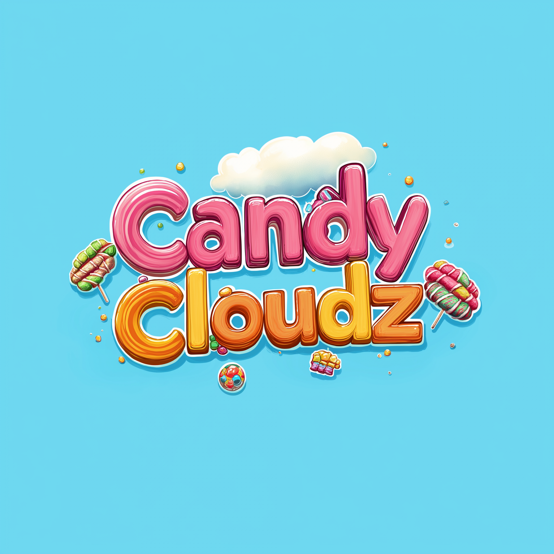 This logo features the name 'Candy Cloudz' crafted from a variety of vibrant candy shapes and colors. The letters are set against an appealing blue background, creating a clear and eye-catching design suitable for packaging.