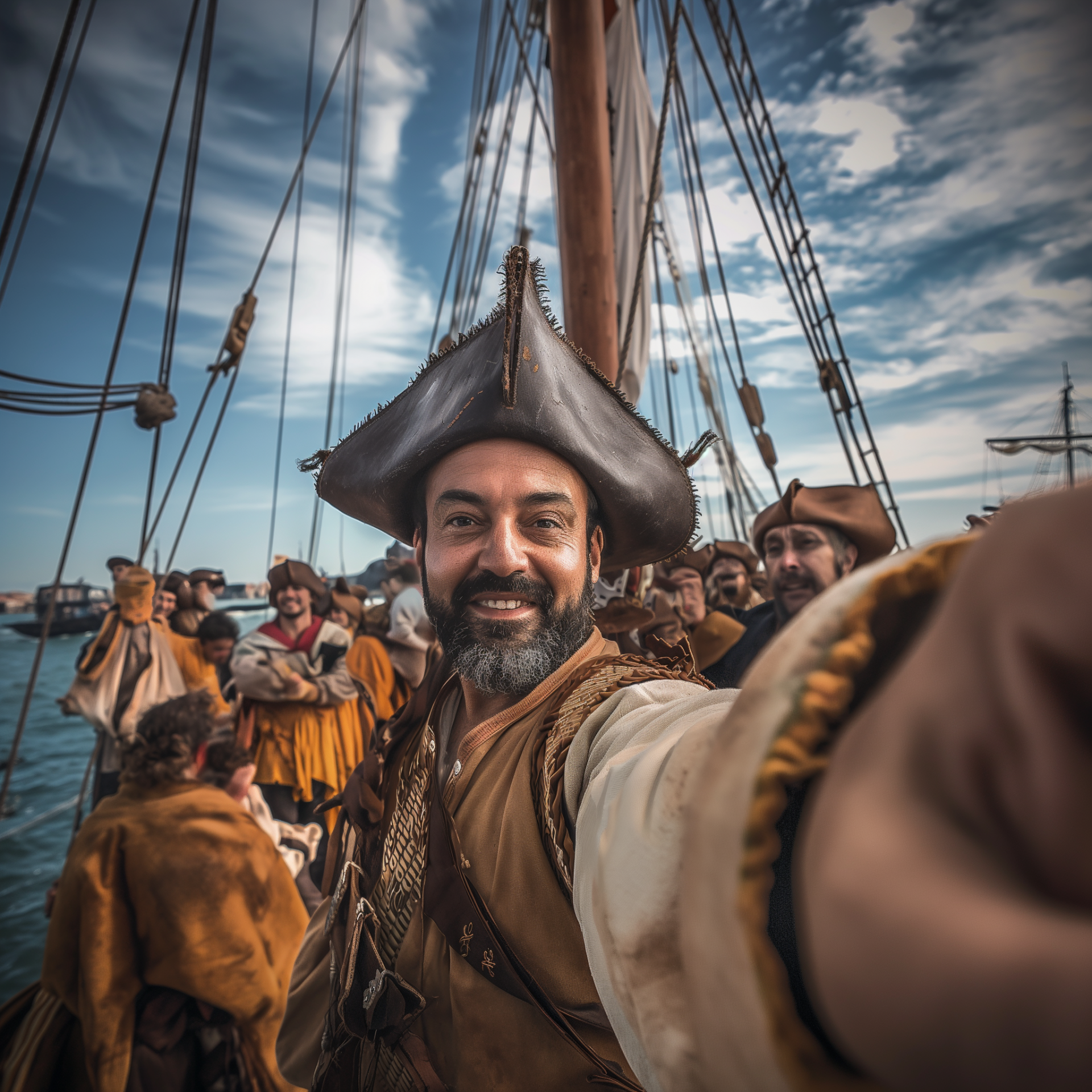 The image captures a historical figure in a modern setting, taking a selfie with a wide-angle perspective. The blend of past and present creates a striking contrast and playful vibe.