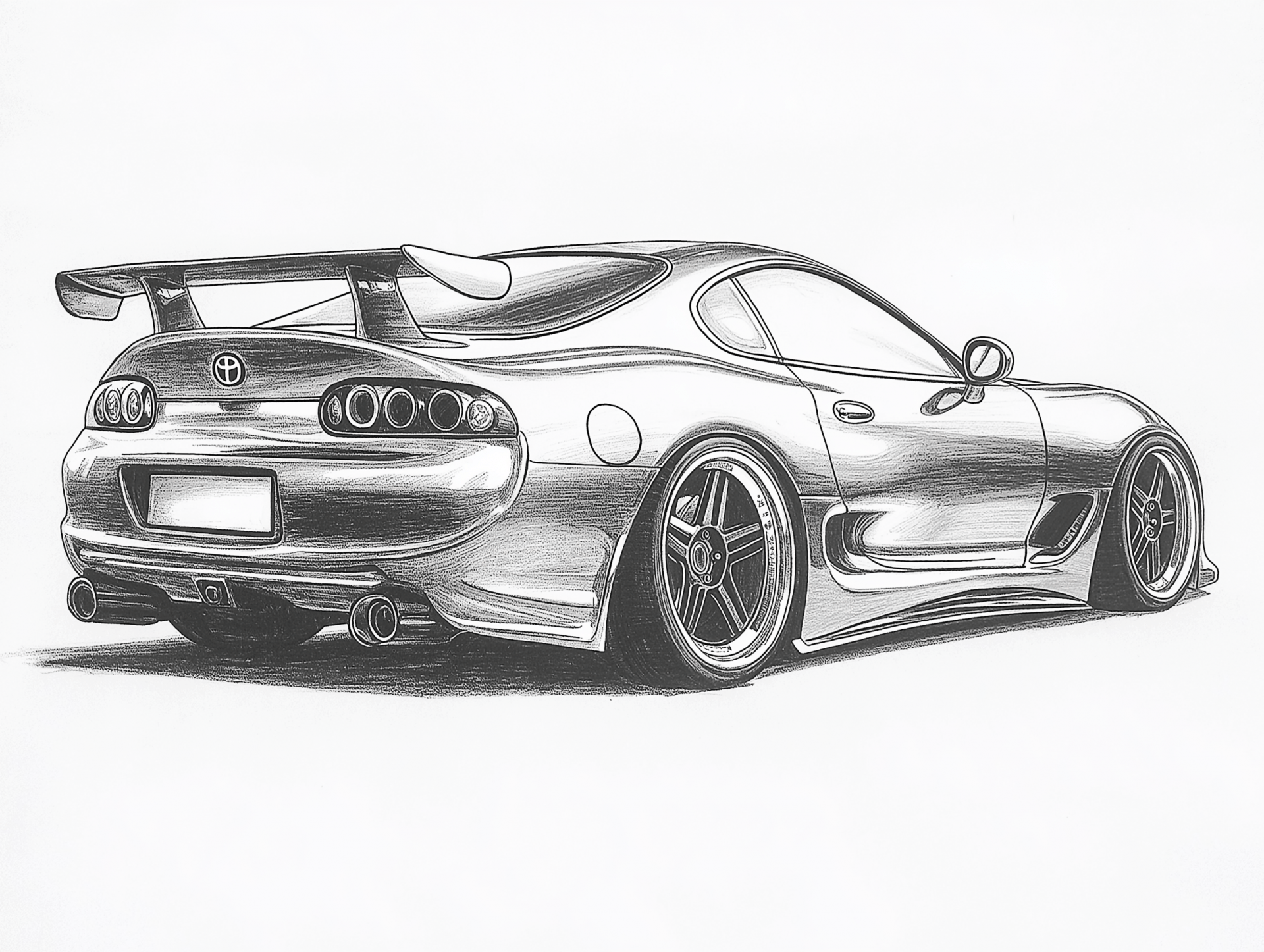 This highly detailed pencil sketch captures the aggressive design and dynamic contours of a tuned Supra MK4. The smooth and precise linework, along with soft gradients for shadows, creates a clean and minimalistic feel against the pure white background.