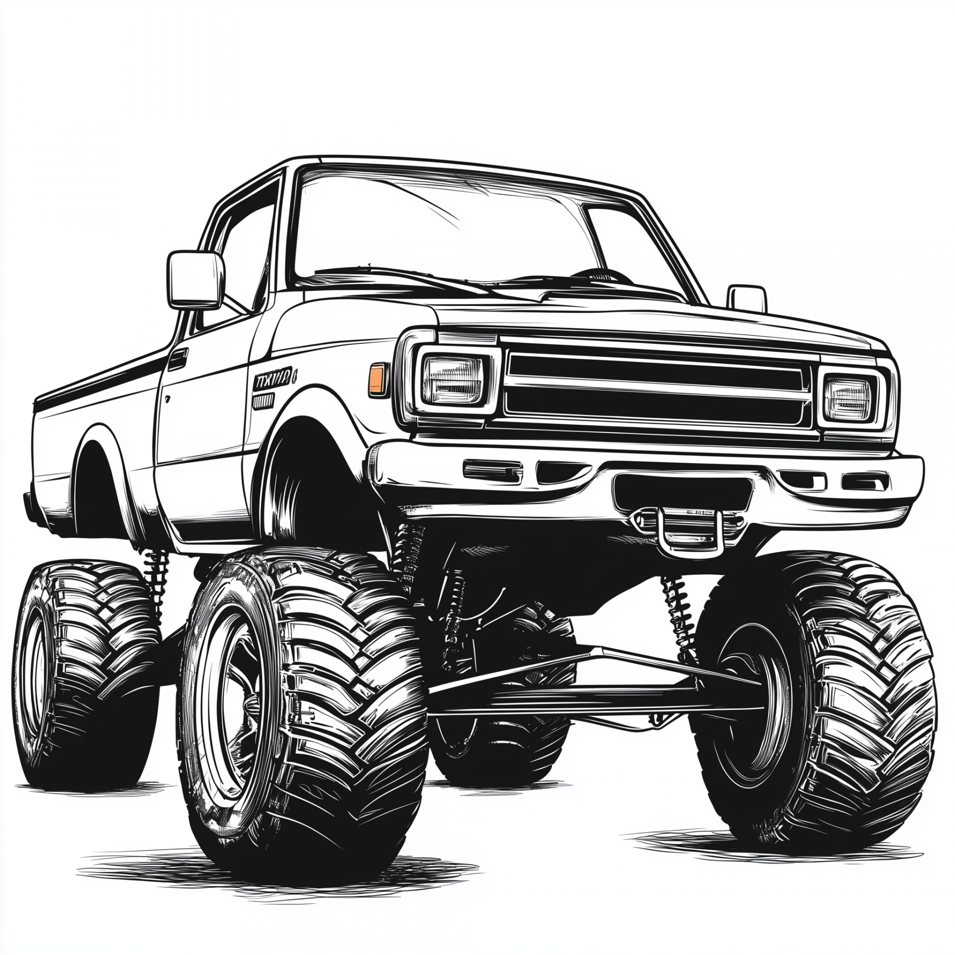 This illustration showcases a stylized front view of an older Toyota truck with larger wheels. The design features a minimalist approach, using only three colors with bold black outlines on a clean white background.