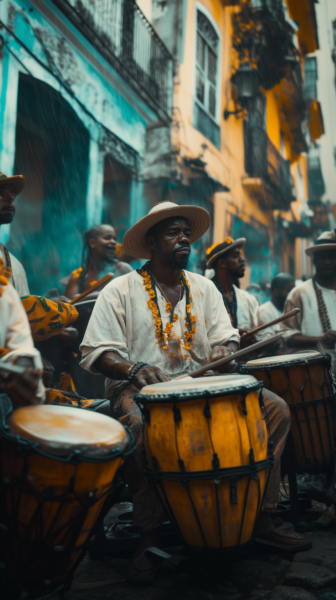 The image captures a lively scene from the 19th century Brazilian street carnaval, filled with energetic performers playing percussion instruments. With a cinematic feel, the low saturation and accent lighting create a warm, nostalgic atmosphere.
