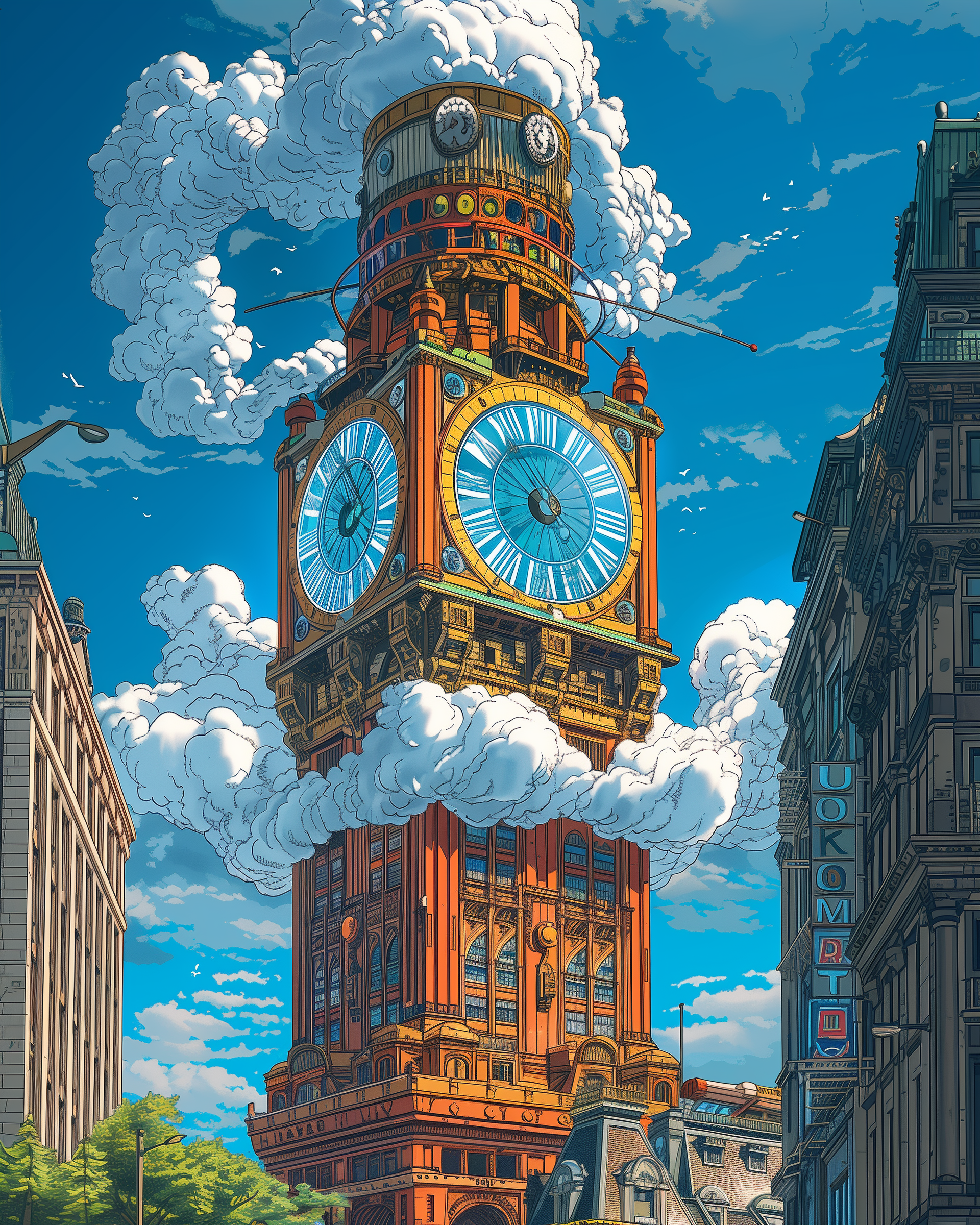 This vibrant illustration features a majestic clock tower made of brass with a steampunk twist. The glossy gears emit a soft glow while steam dances around the structure under a clear blue sky.