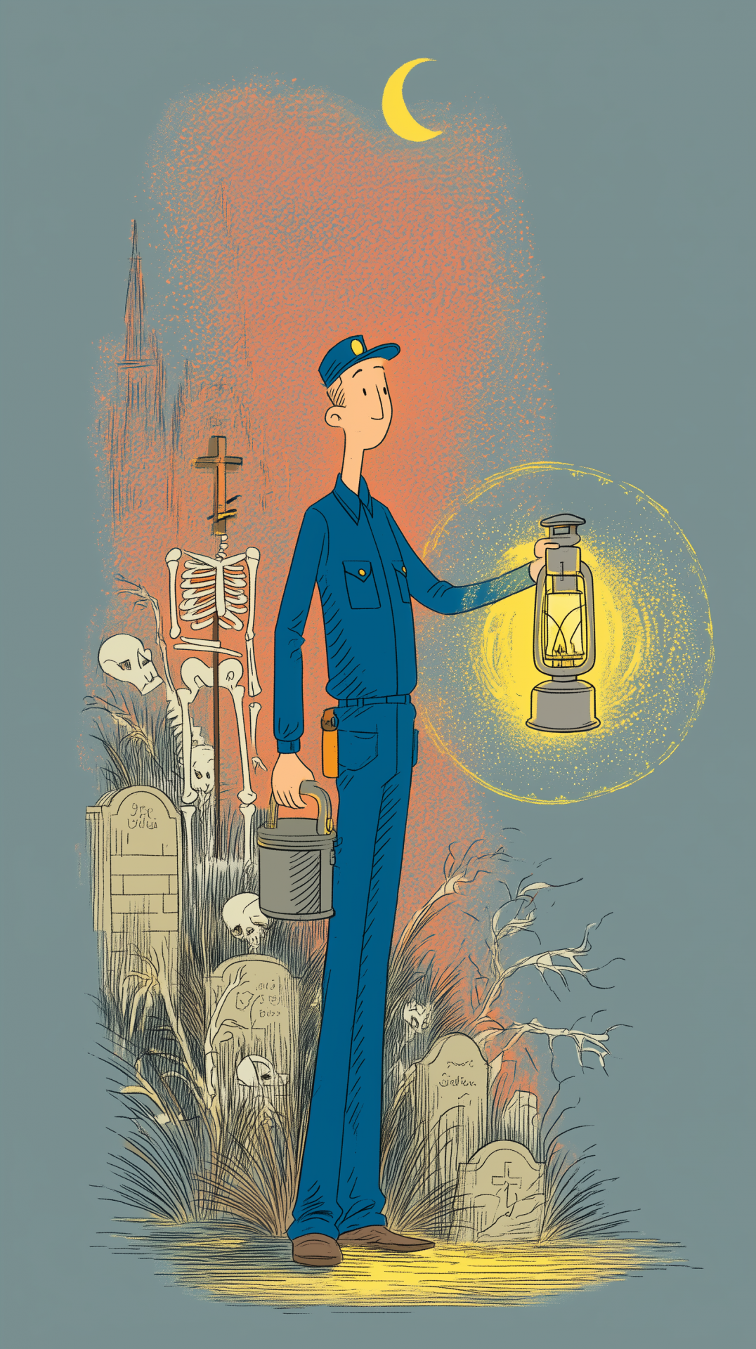 This illustration features a young man holding a vintage lamp, surrounded by tombstones illuminated by a soft halo of light. The scene is set under a crescent moon, rendered in a low saturated color palette with a cartoonish style.