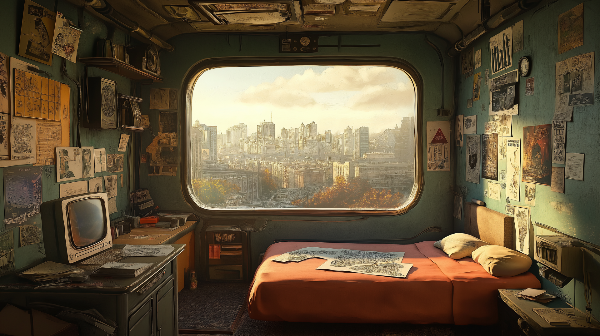The image depicts a cartoon-style room from the 1960s, featuring a central rectangular bunker-style window. The walls are filled with numerous documents and images of landscapes, all taped up, creating a nostalgic and cluttered ambiance.