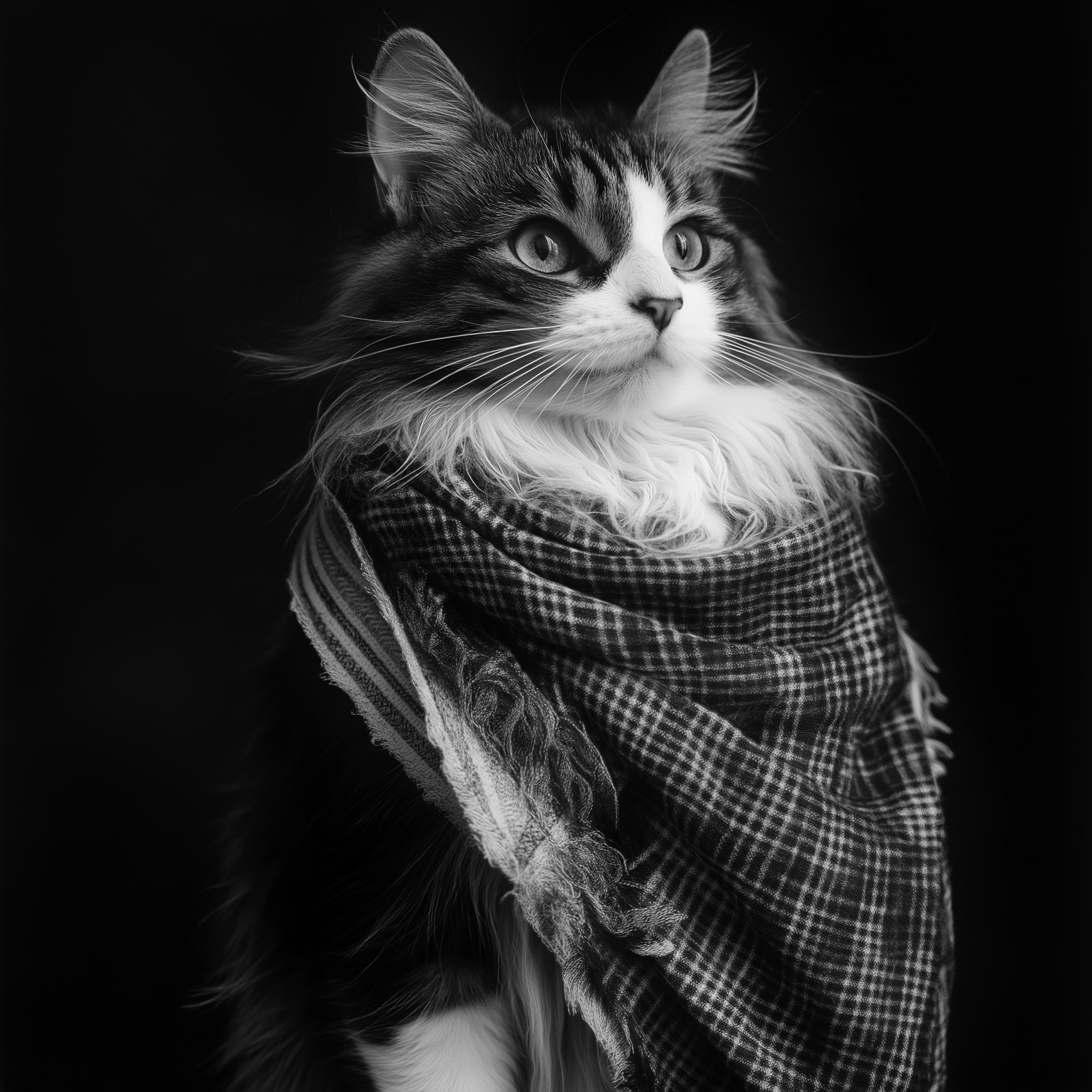 This image features a striking high contrast black and white tabby cat standing proudly with its large fluffy tail raised. The cat is adorned with a keffiyeh, adding a unique and bold element to the scene.