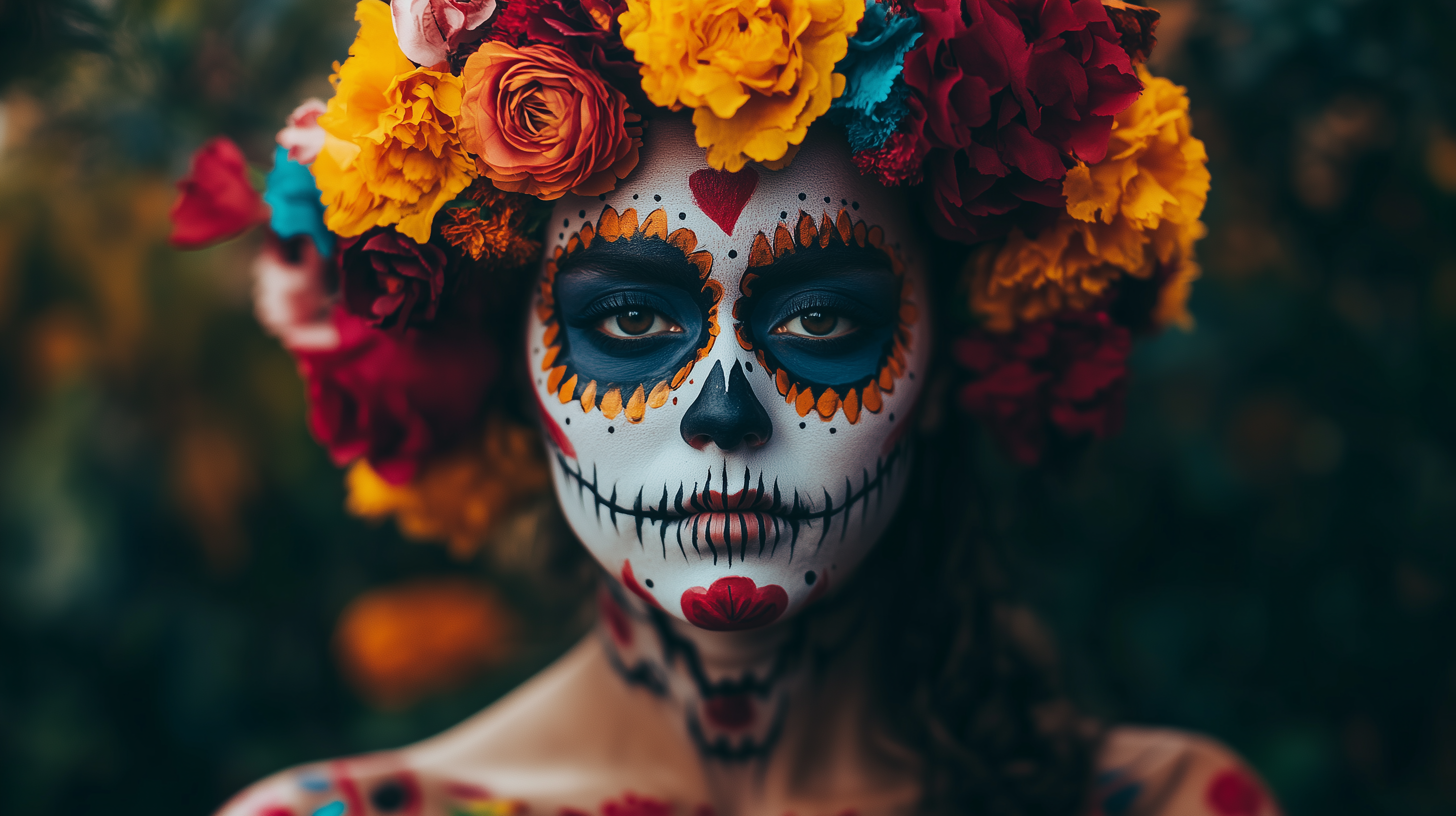 The image features a colorful and vibrant celebration filled with traditional decorations and symbols of the Day of the Dead. You might see beautifully crafted skulls and altars adorned with flowers, candles, and photographs, creating a festive and respectful atmosphere.