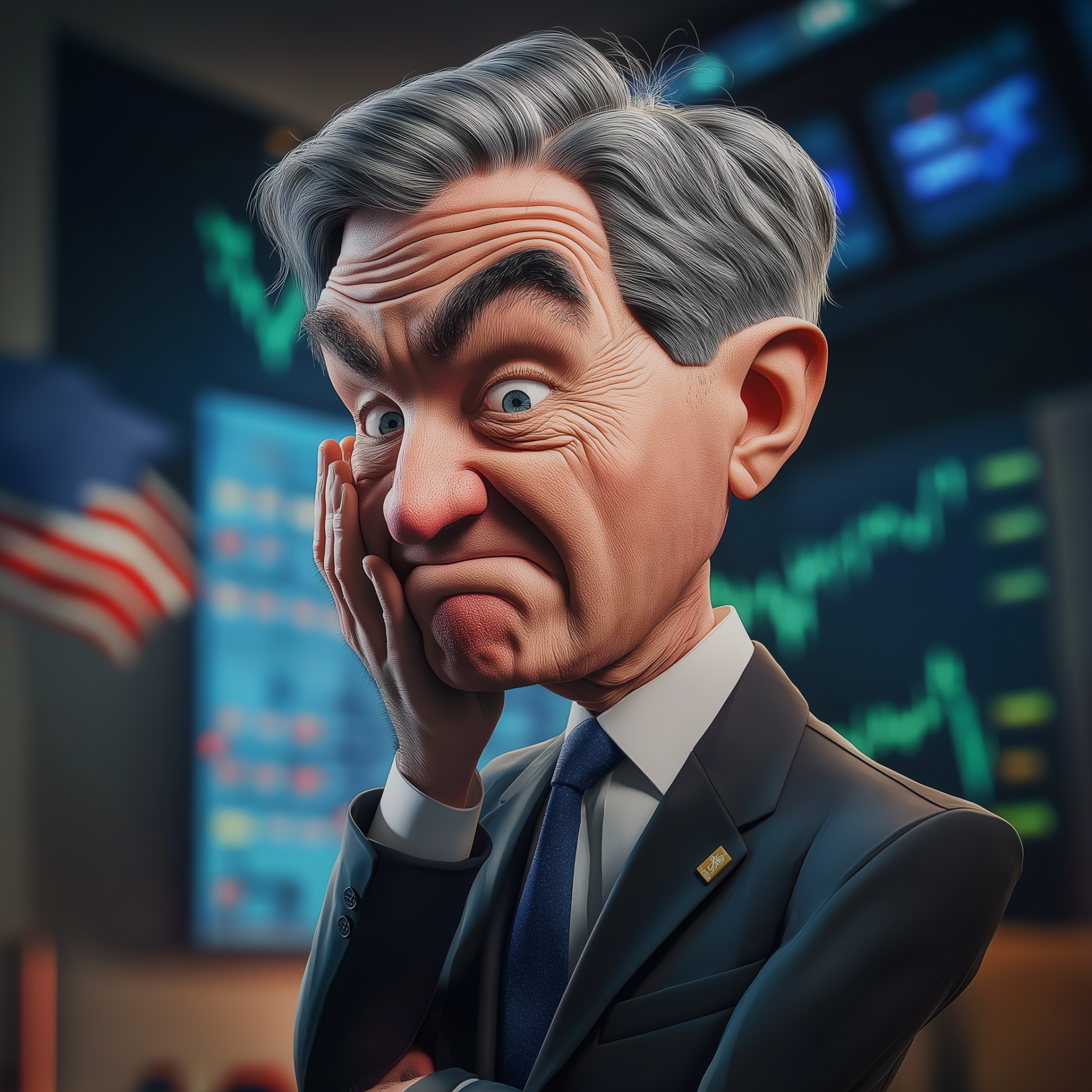 This image presents a humorous caricature of a central bank official, expressing frustration with a facepalm gesture. In the background, stock market charts depict a downward trend, enhancing the overall theme of economic worry.