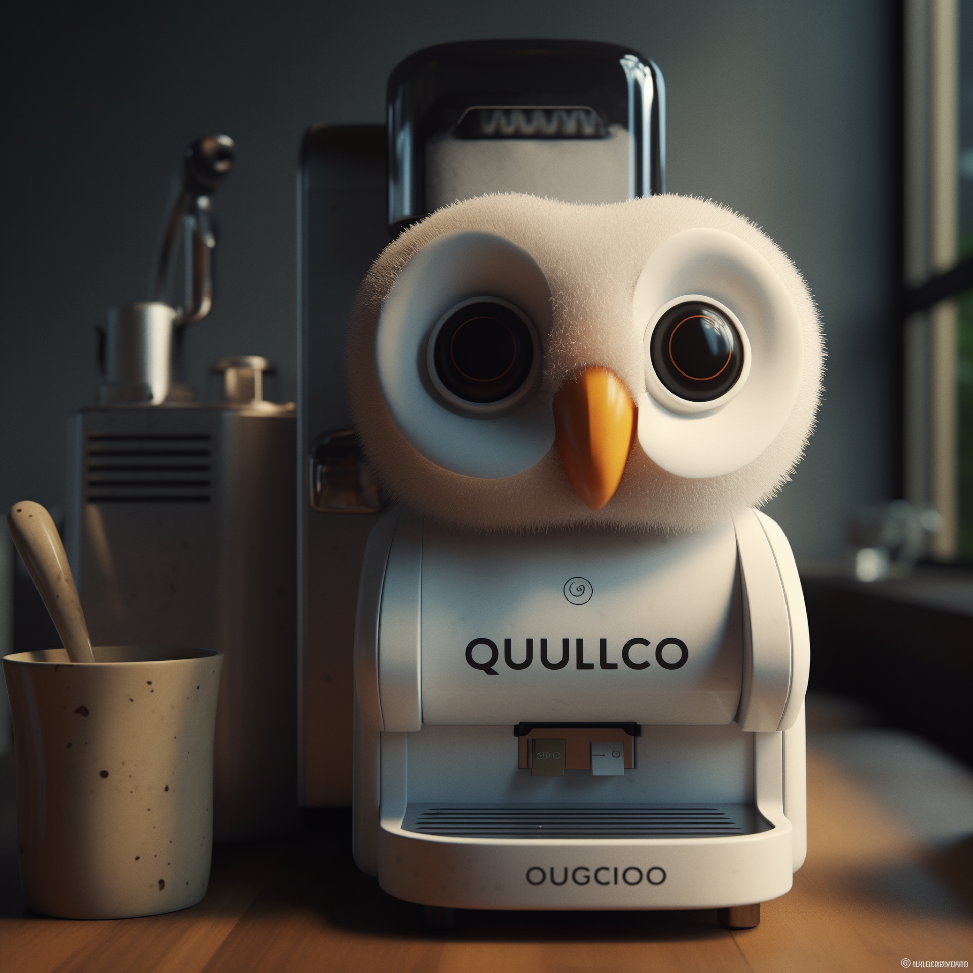 The image showcases a coffee machine designed to resemble the Duolingo mascot, featuring ultra-detailed textures and dramatic lighting. Its realistic design is enhanced by a cinematic style that captures attention and evokes interest.