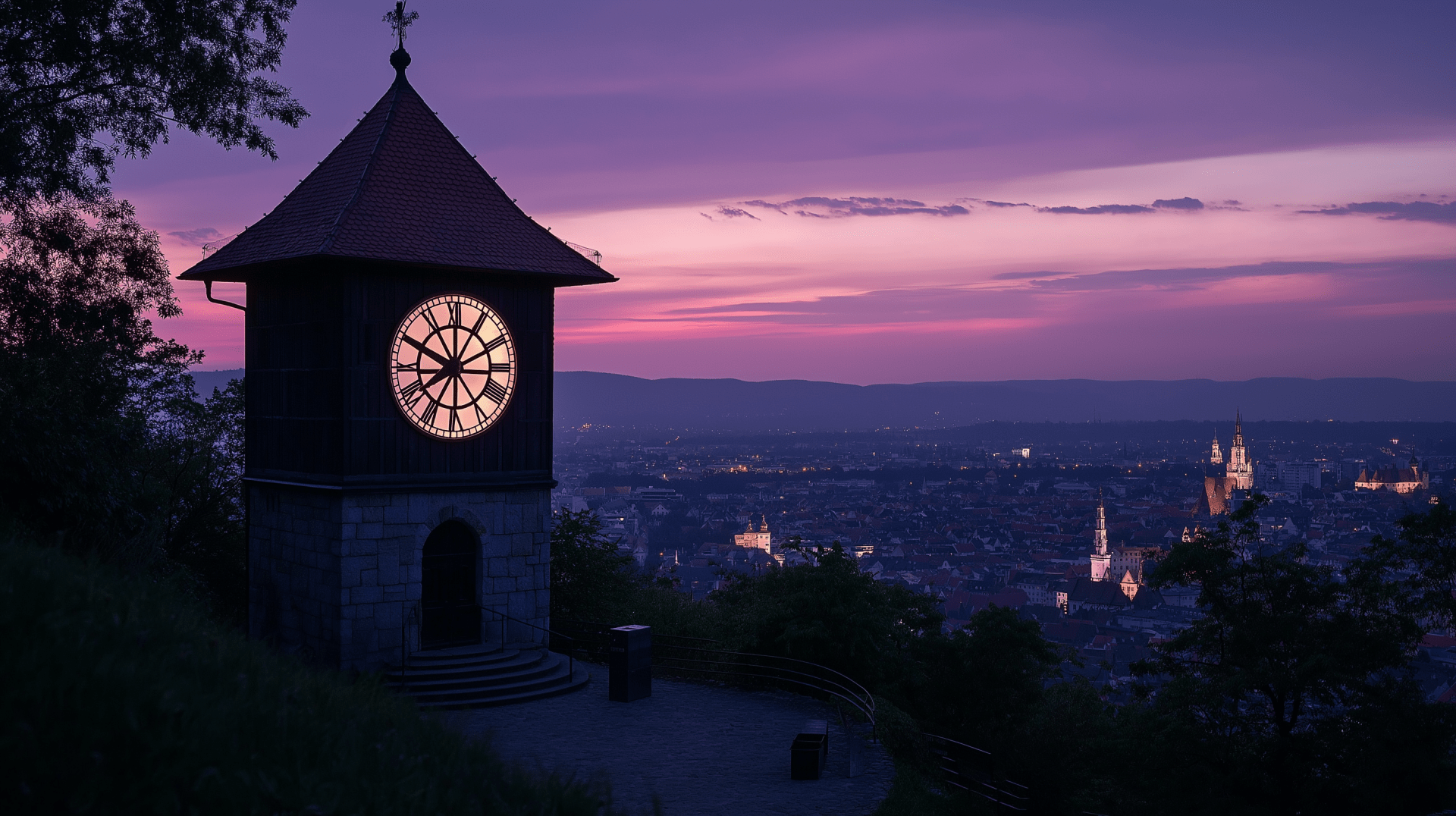 The image showcases the iconic clock tower situated on Schloßberg hill, overlooking the city of Graz. With a stunning panoramic view in the background, the scene is enhanced by soft pink highlights that create a romantic atmosphere.