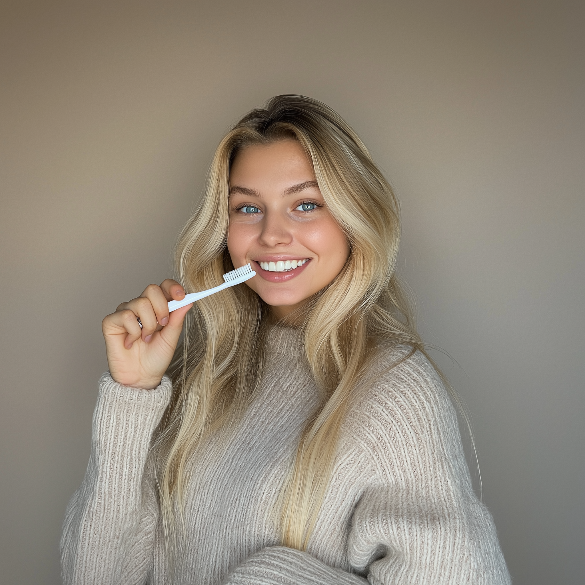 This image features a charming Lithuanian woman holding a toothbrush, showcasing her radiant smile. The aesthetic is cute and inviting, highlighting her friendly demeanor.