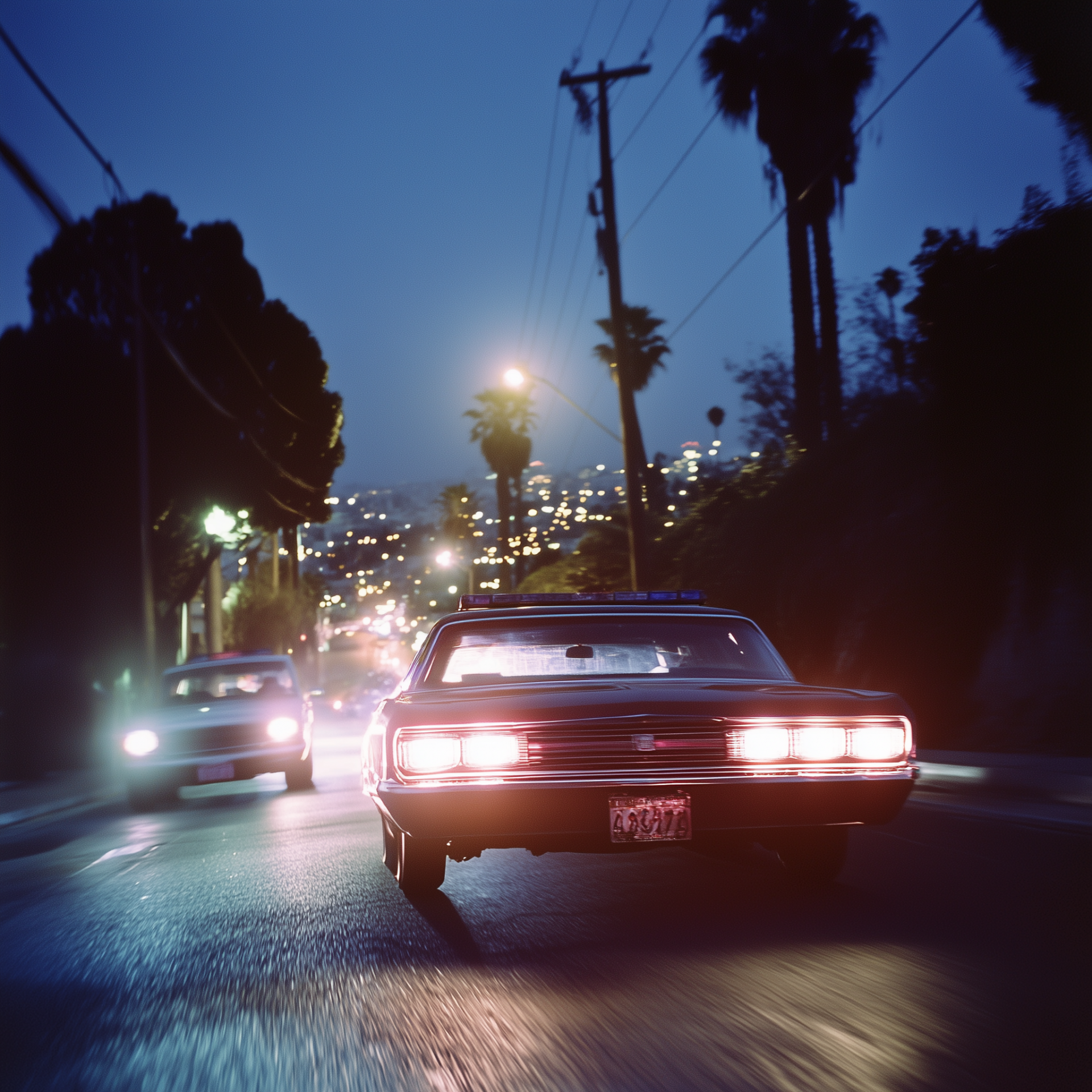 This image captures a high-energy scene of a police car in pursuit of a low rider from a top view. The vibrant cityscape of Los Angeles adds to the thrilling atmosphere of the chase.