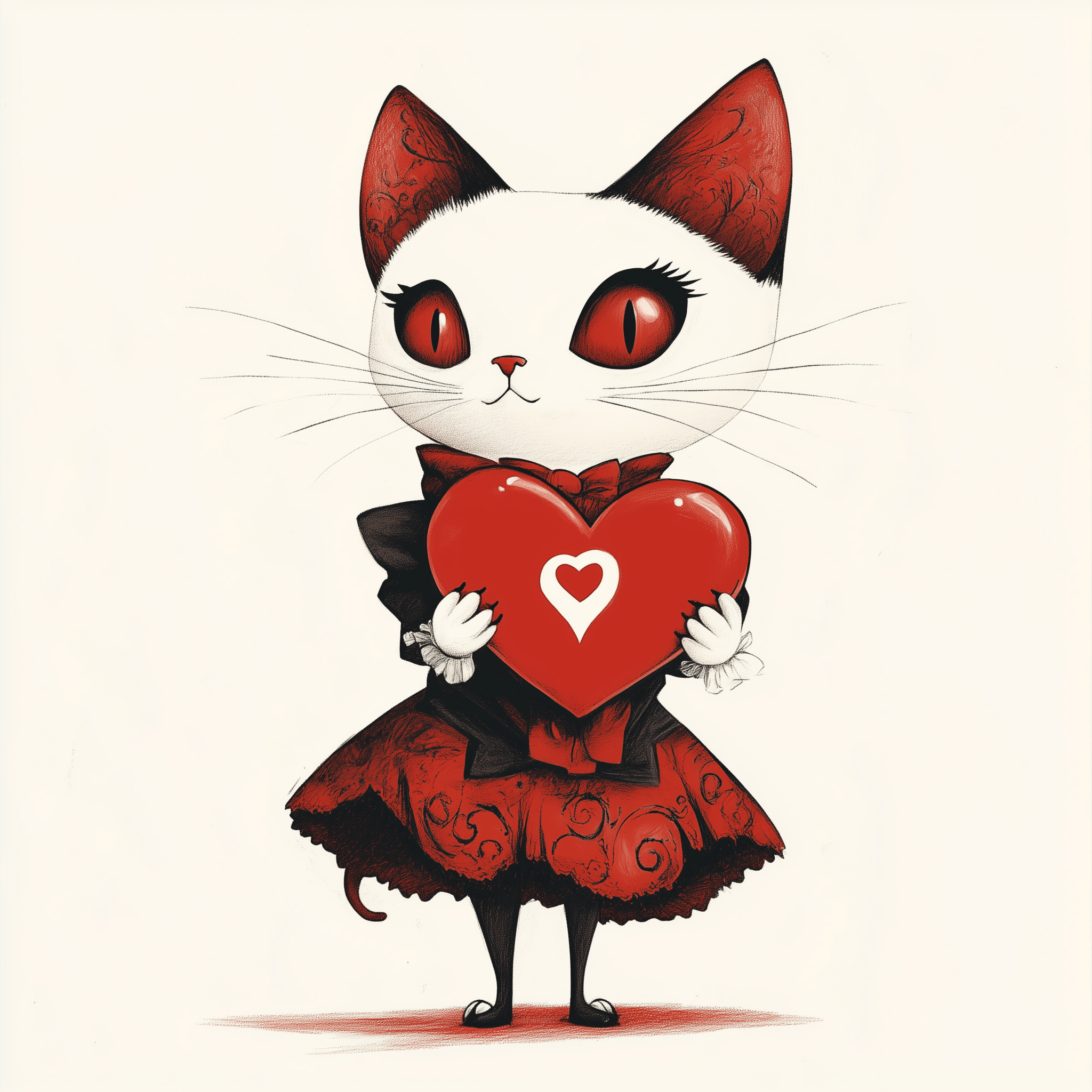 A cheerful cat is playfully interacting with a bright red heart shape. The simple white background enhances the lighthearted and joyful atmosphere of the image.