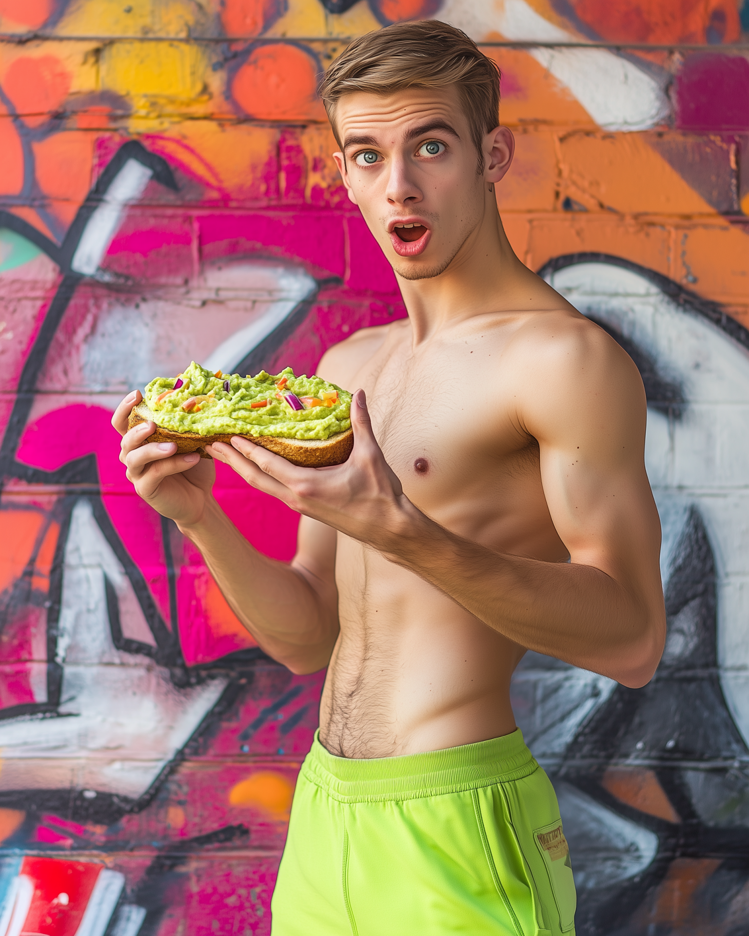 The image features a young, slim man in vibrant green shorts, displaying a joyful expression as he enjoys a delicious avocado toast. Bright graffiti art fills the background, creating a fun and lively atmosphere that complements the cheerful mood.