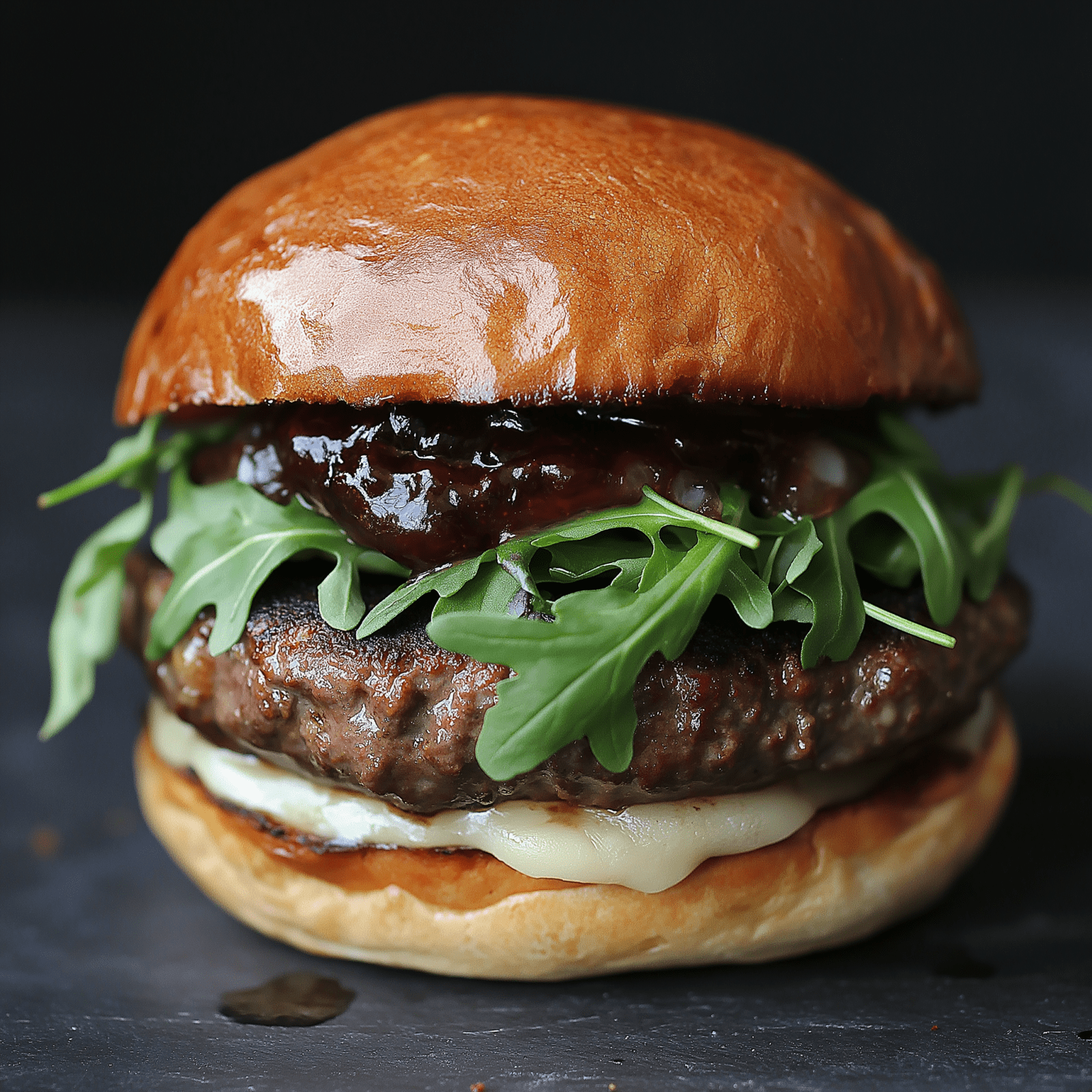 A delicious cheeseburger featuring a bottom bun layered with rich manchego cheese, fresh arugula, and caramelized shallots. The top bun is spread with a sweet fig jam, adding a delightful contrast to the savory elements.