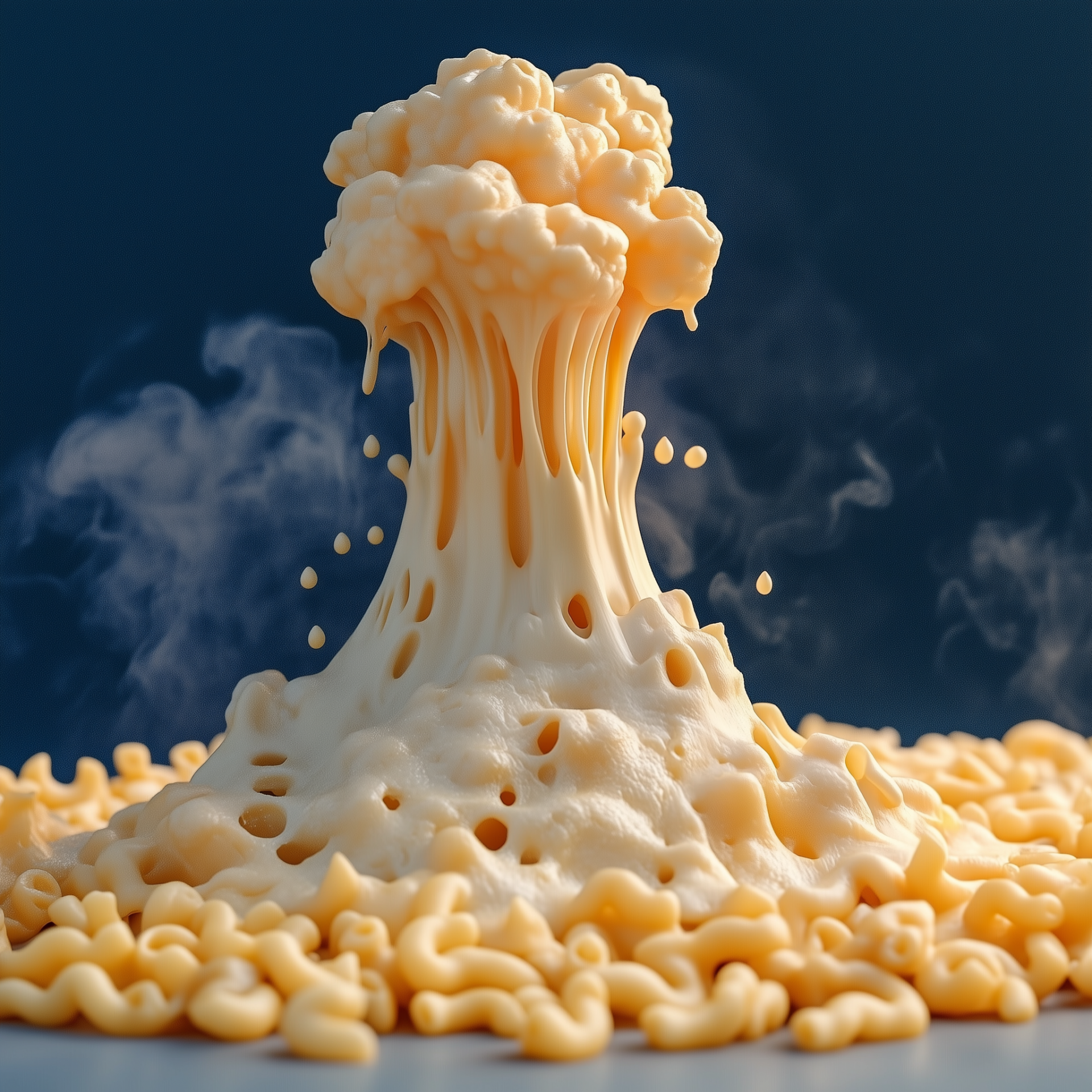 The image depicts a whimsical landscape dominated by a cheese volcano erupting gooey cheese. Surrounding the volcano is a flat expanse of mac and cheese, creating a surreal and playful atmosphere.