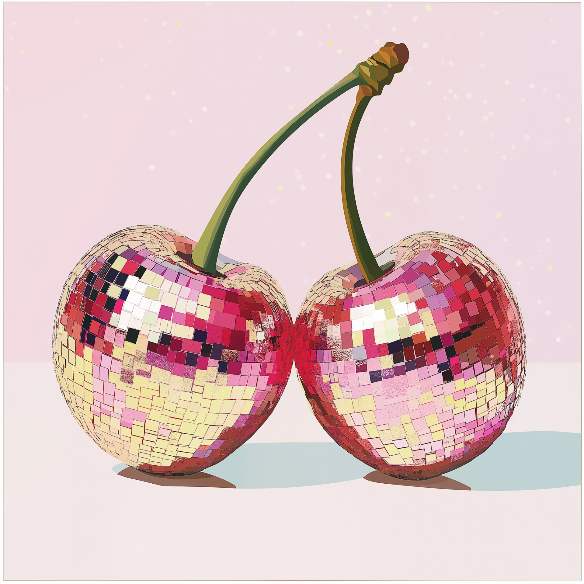 This oil painting showcases a vibrant portrayal of a disco ball intertwined with bright red cherries. The contrast against the white background enhances the lively and playful nature of the composition.