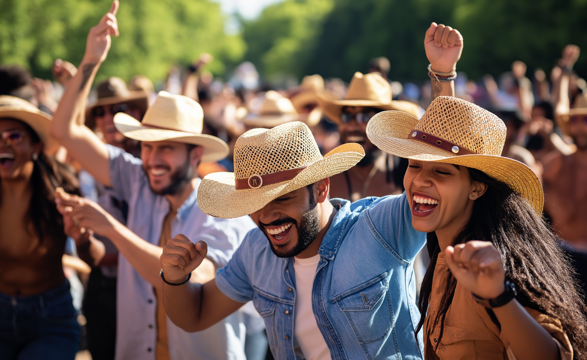 A vibrant group of diverse men and women are joyfully dancing on Lakeshore Drive, illuminated by the bright sun. They all sport matching straw hats, creating a fun and lively atmosphere after the marathon.