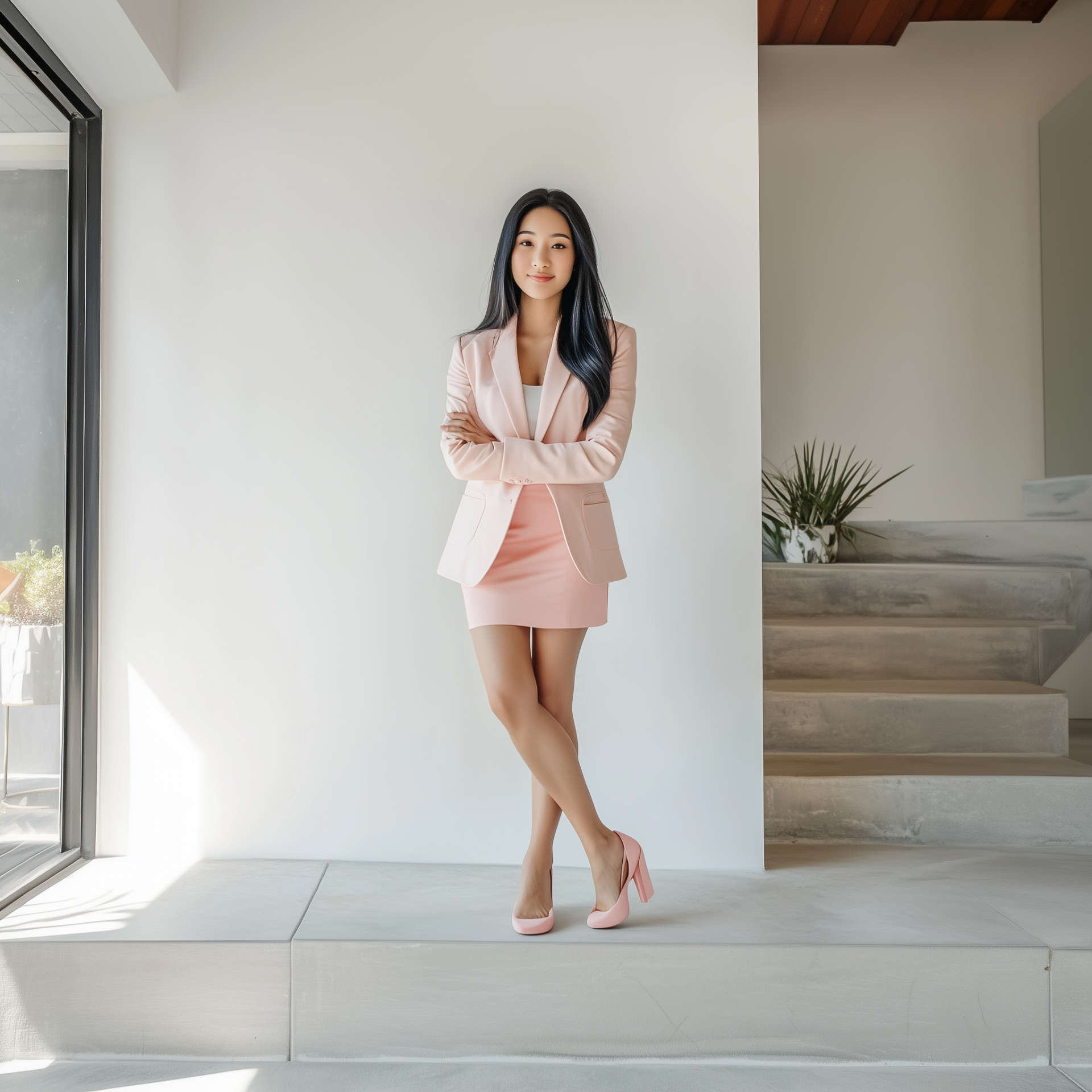 A confident Asian woman stands in a minimalist interior, exuding elegance in her pink attire. The soft natural lighting enhances the simple yet chic atmosphere surrounding her.