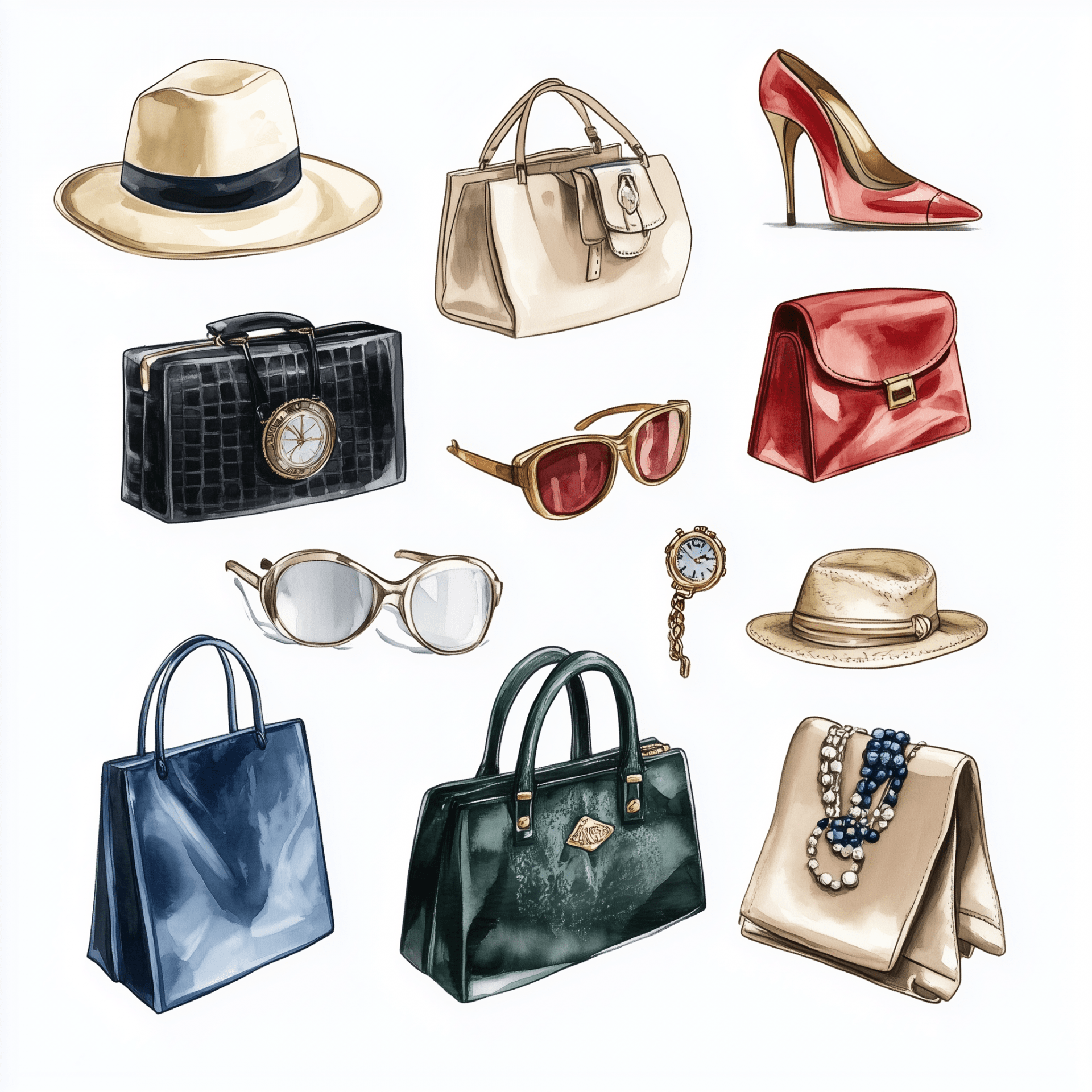This image features a collection of luxury women's fashion items, beautifully illustrated in a chic and sophisticated style. The items are elegantly displayed against a crisp white background, creating a striking visual that embodies high fashion.