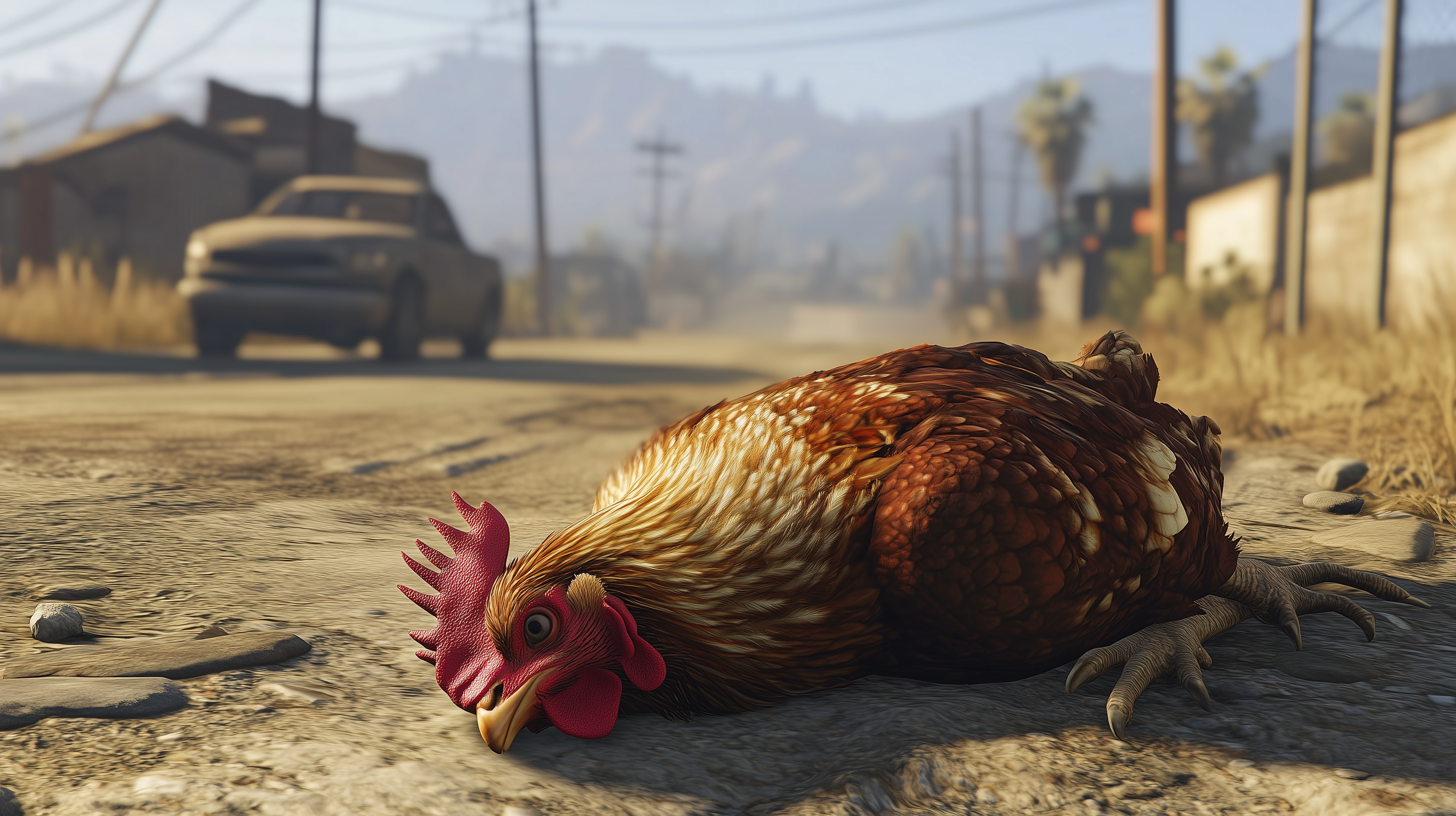 This image depicts a dramatic scene where a chicken is situated in a high-stakes moment, reminiscent of a video game narrative. The atmosphere is tense and filled with vibrant colors, juxtaposing the intensity with the absurdity of the scenario.