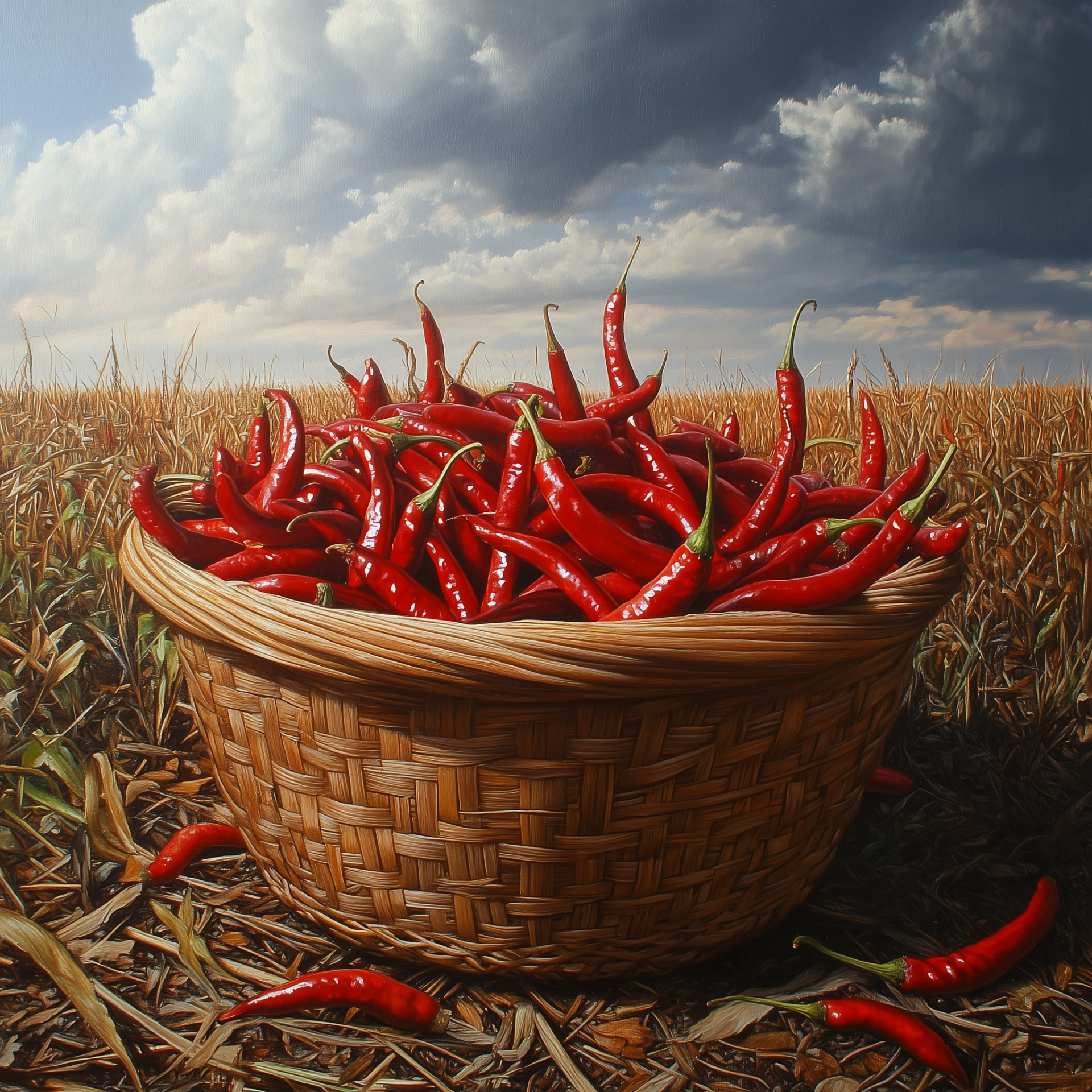This image showcases a realistic depiction of vibrant red chillis arranged neatly in a cane basket. The background features a lush green field that adds to the natural appeal of the scene.