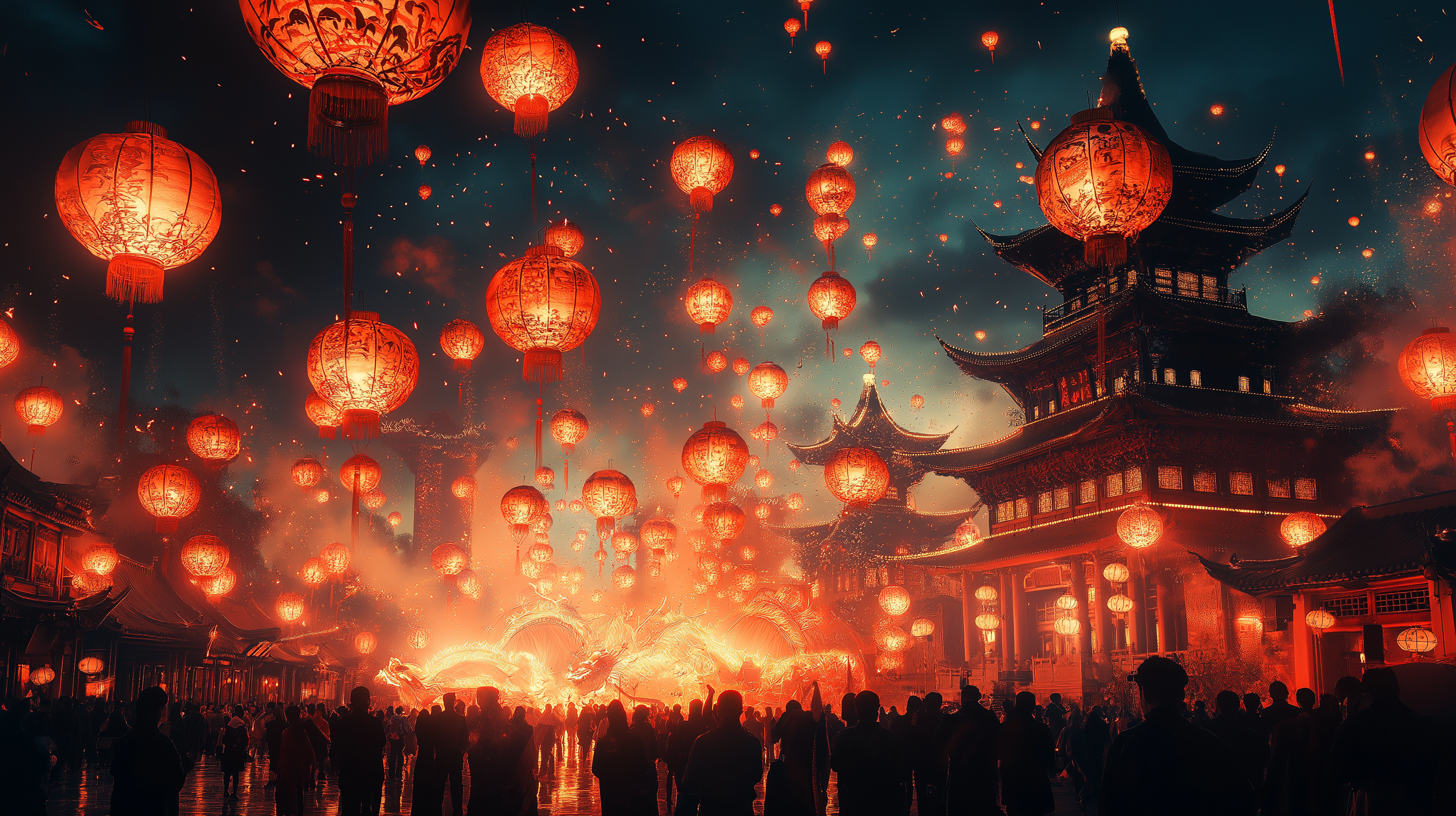 The image captures a lively street scene filled with vibrant red lanterns. People dressed in traditional attire participate in a colorful dragon dance, creating a festive atmosphere.