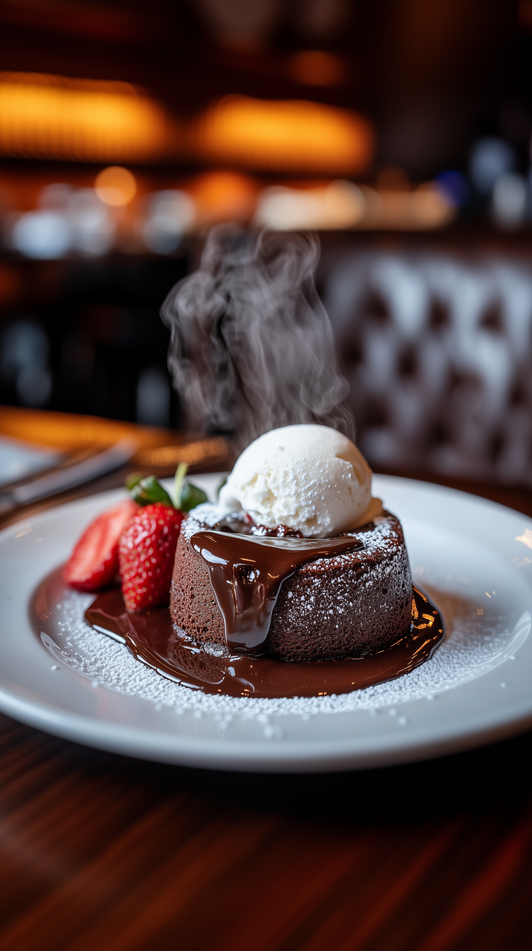 The image features an indulgent chocolate lava cake with rich molten chocolate flowing from the center. Surrounding the cake, a scoop of melting vanilla ice cream and elegantly arranged fresh strawberries create a cozy and luxurious atmosphere.