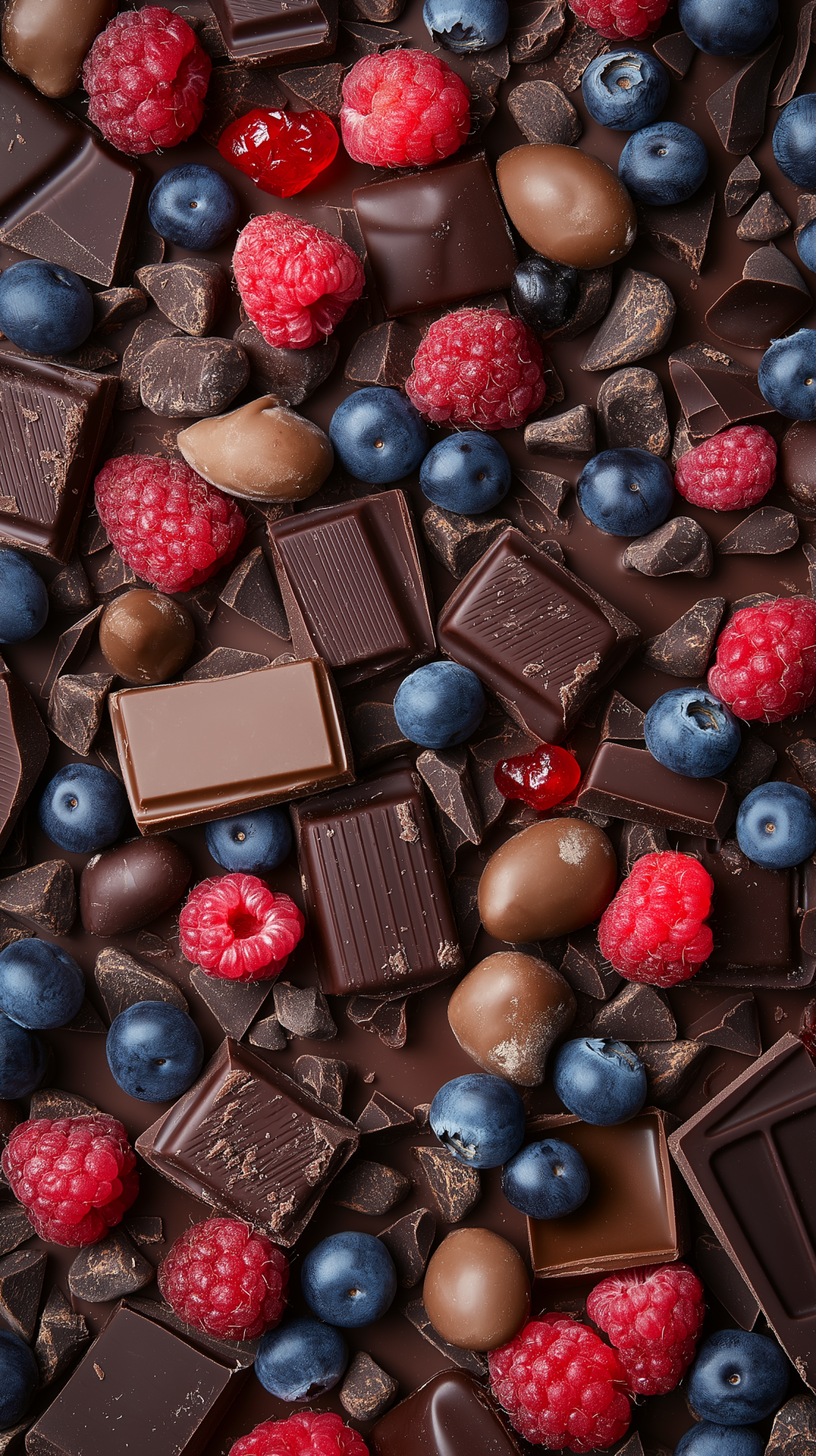 This image features a top view of an assortment of chocolates arranged beautifully on a surface. The gourmet presentation is enhanced by the inclusion of blueberries and red fruits, creating a poetic atmosphere.